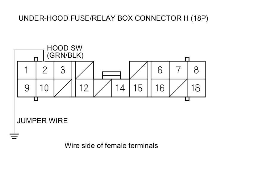 12. Connect under-hood fuse/relay box connector H (18P) terminal No. 2 and body ground with a jumper wire.