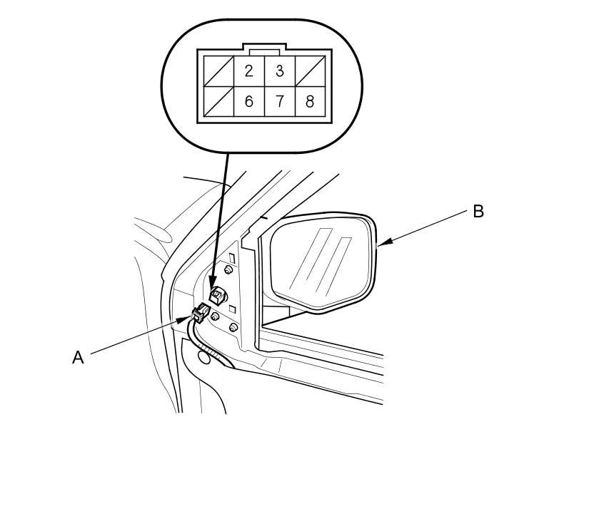 2. Disconnect the 8P connector (A) from the power mirror actuator (B).