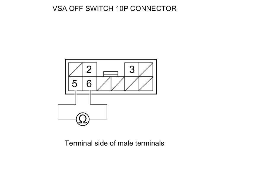 4. Check for continuity between the VSA OFF switch 10P connector terminals No. 5 and No. 6. There should be continuity at all times.