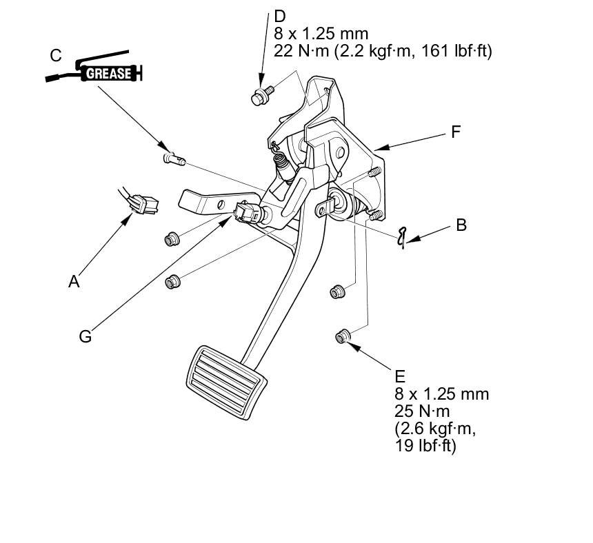 4. Remove the brake pedal bracket mounting bolt (D) and nuts (E).