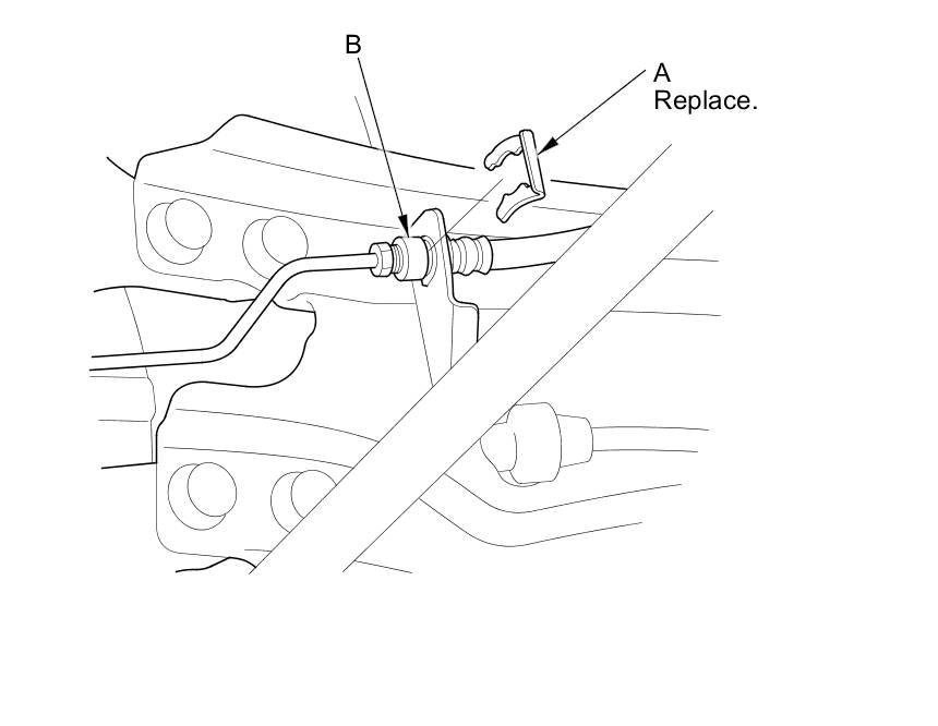 4. Remove and discard the brake hose clip (A) from the brake hose (B).