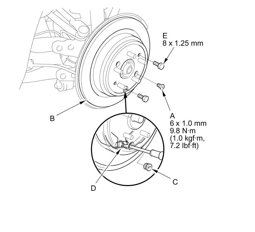 - If the brake disc/drum is stuck to the hub, thread two 8 x 1.25 mm bolts (E) into the brake disc/drum to push it away from the hub. Turn each bolt 90 degrees at a time to prevent the brake disc/drum from binding.
