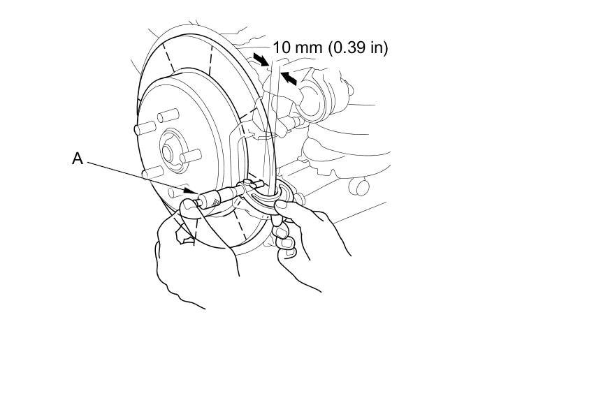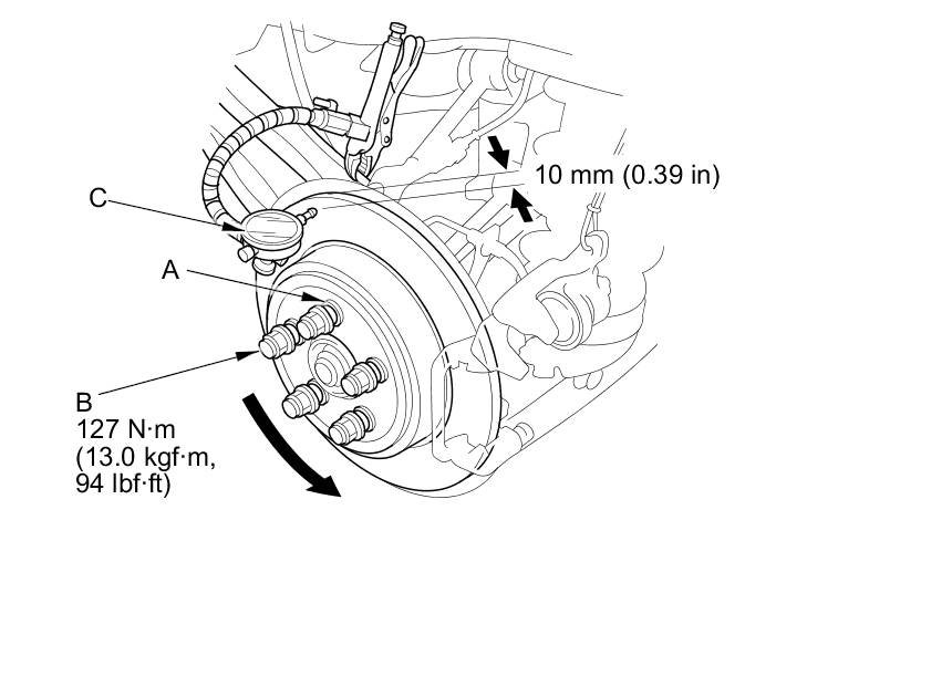 6. Set up the dial gauge (C) against the brake disc/drum as shown, and measure the runout at 10 mm (0.39 in) from the outer edge of the brake disc/drum.