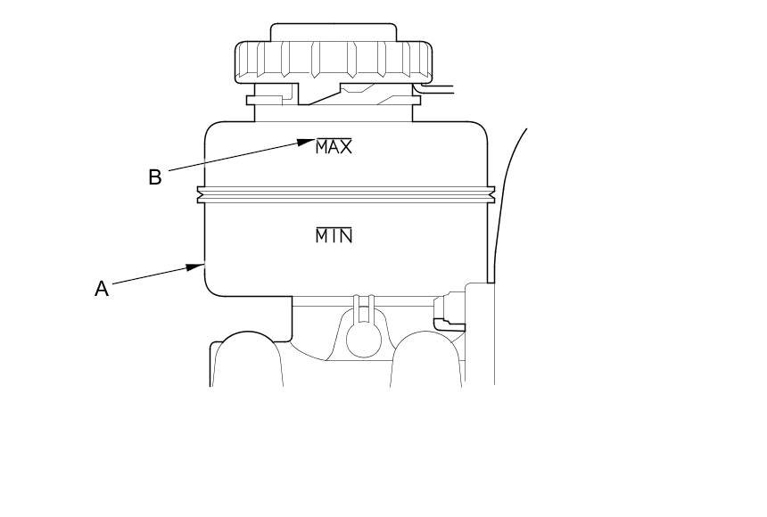 1. Make sure the brake fluid level in the reservoir (A) is at the MAX (upper) level line (B).