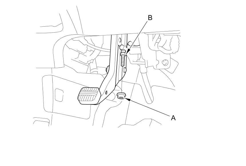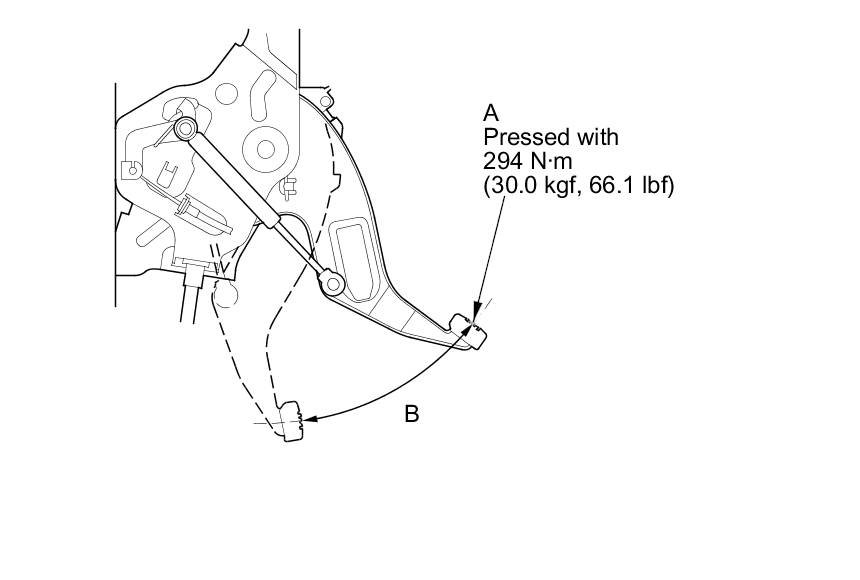 1. Press the parking brake pedal (A) with 294 N (30.0 kgf, 66.1 lbf) of force to fully apply the parking brake. The parking brake pedal should be locked within the specified number of clicks (B).