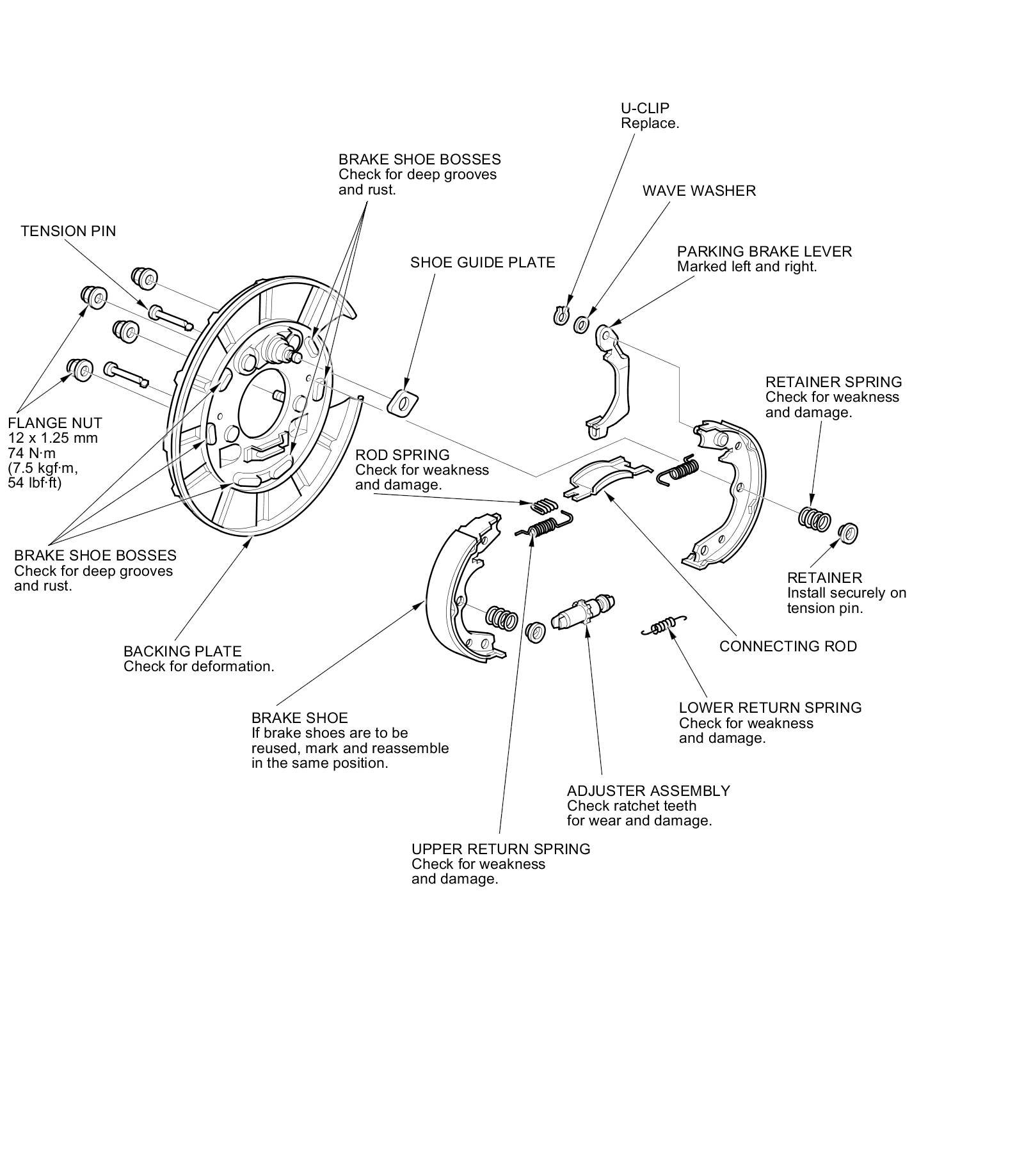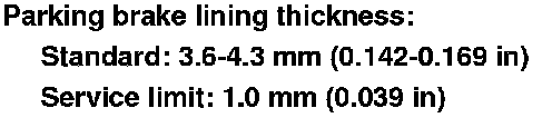 6. If any part of the parking brake lining thickness is less than the service limit, replace all the parking brake shoes as a set Removal and Replacement.