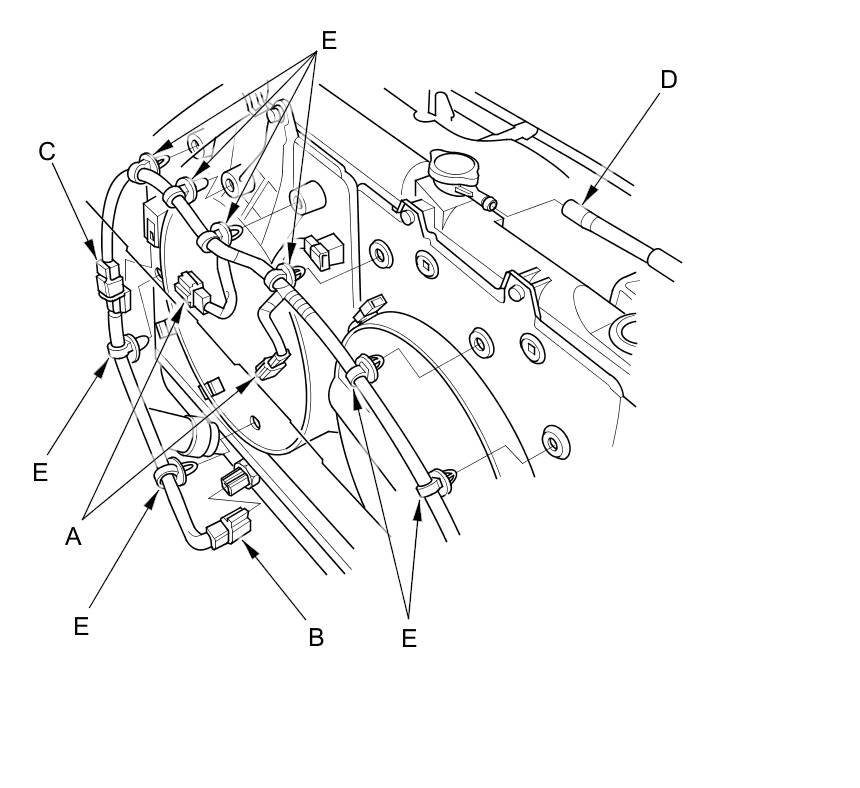 3. Disconnect the fan motor connectors (A), the ECT sensor 2 connector (B), the harness connector (C) and the coolant reservoir hose (D), then remove the harness clamps (E).