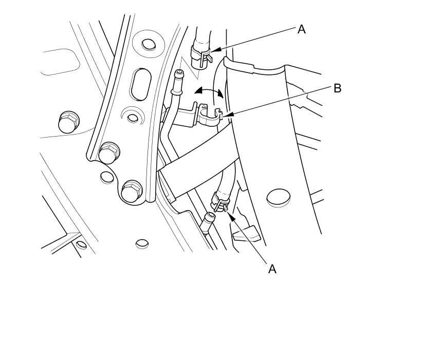 8. Unclamp the ATF cooler hose clamp (B) on the ATF cooler line.