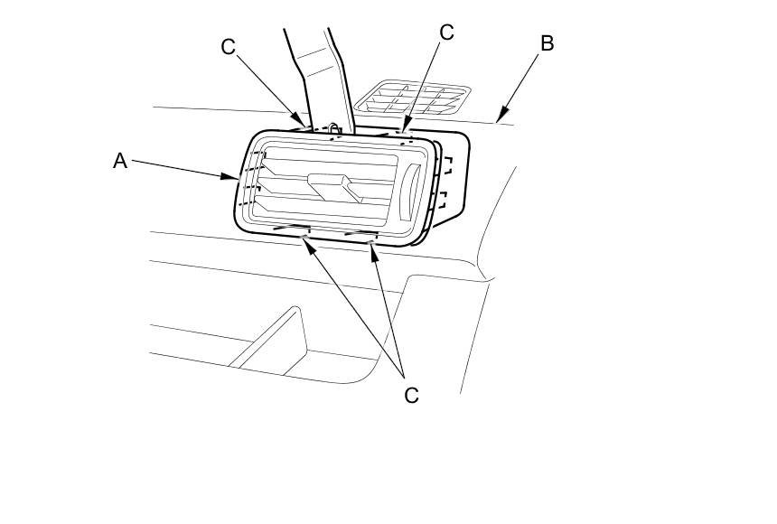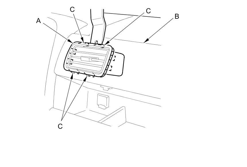 4. Insert the appropriate trim tool into the gap between the dashboard vent (A) and the dashboard (B), and release the hooks (C).