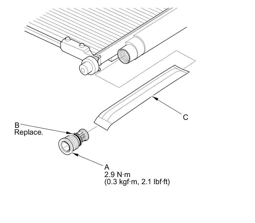 2. Remove the cap (A) from the bottom of the A/C condenser. Remove the O-ring (B) and the desiccant (C).