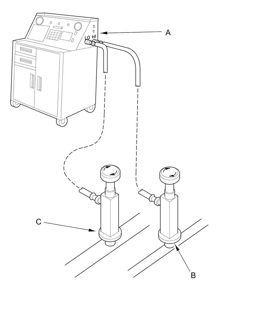 2. Connect an R-134a refrigerant recovery/recycling/ charging station (A) to the high-pressure service port (B) and the low-pressure service port (C), as shown, following the equipment manufacturer's instructions.