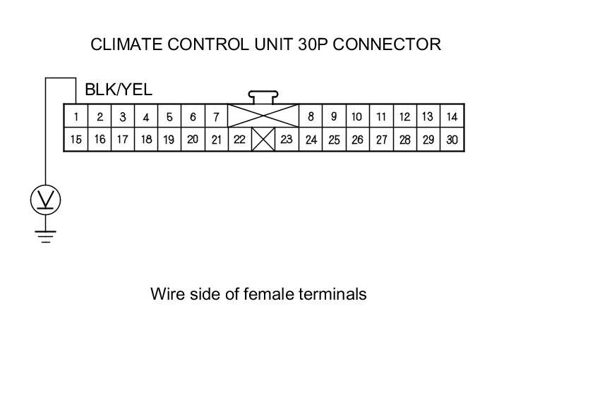 4. Measure the voltage between climate control unit 30P connector terminal No. 1 and body ground.