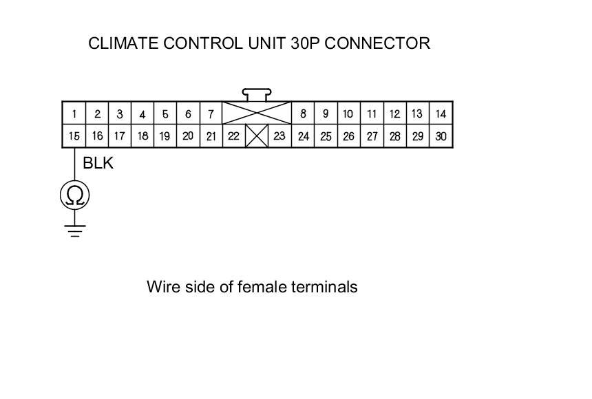 6. Check for continuity between climate control unit 30P connector terminal No. 15 and body ground.