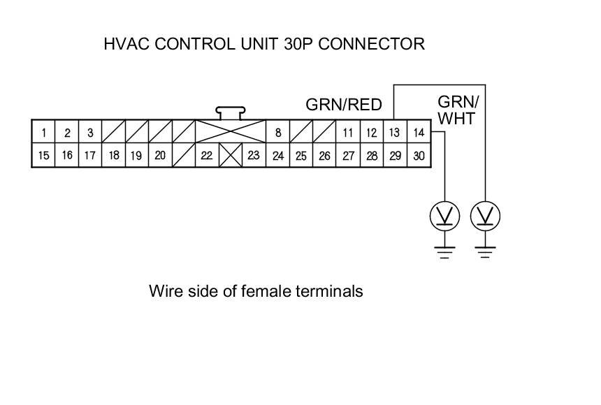 8. Check for continuity between body ground and HVAC control unit 30P connector terminals No. 13 and No. 14 individually.