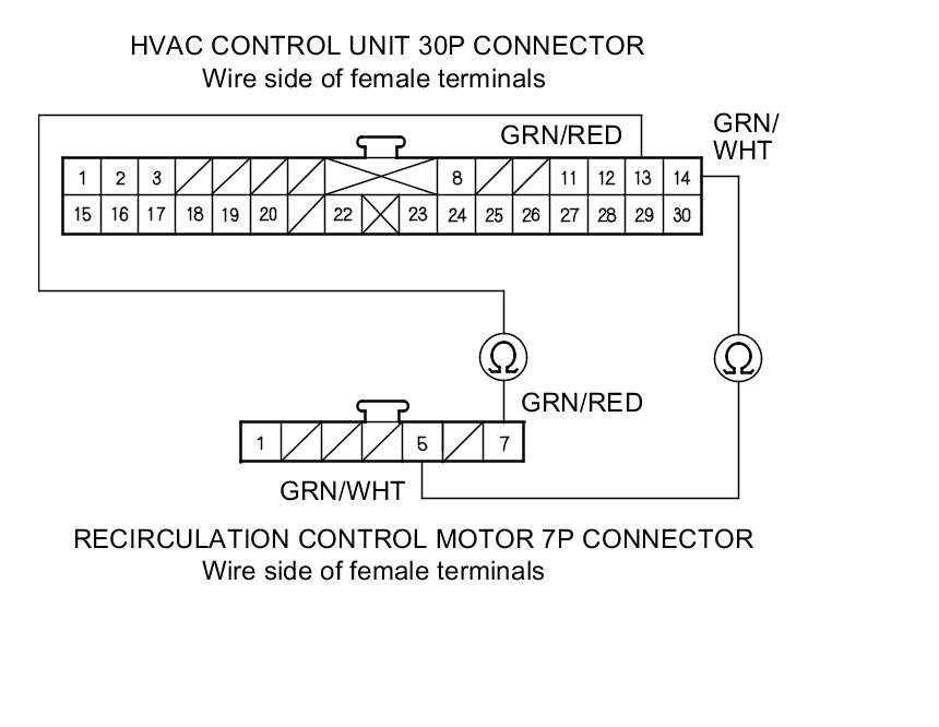 11. Check for continuity between the following terminals of the HVAC control unit 30P connector and the recirculation control motor 7P connector.
