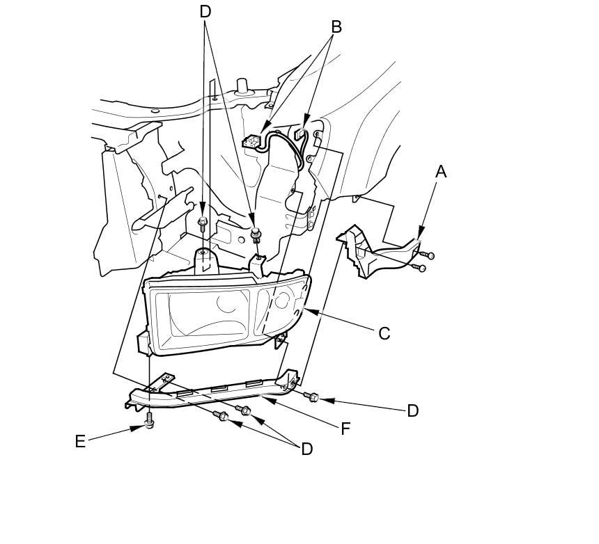 5. Remove the bolt (E) and the corner upper beam (F) from the headlight.