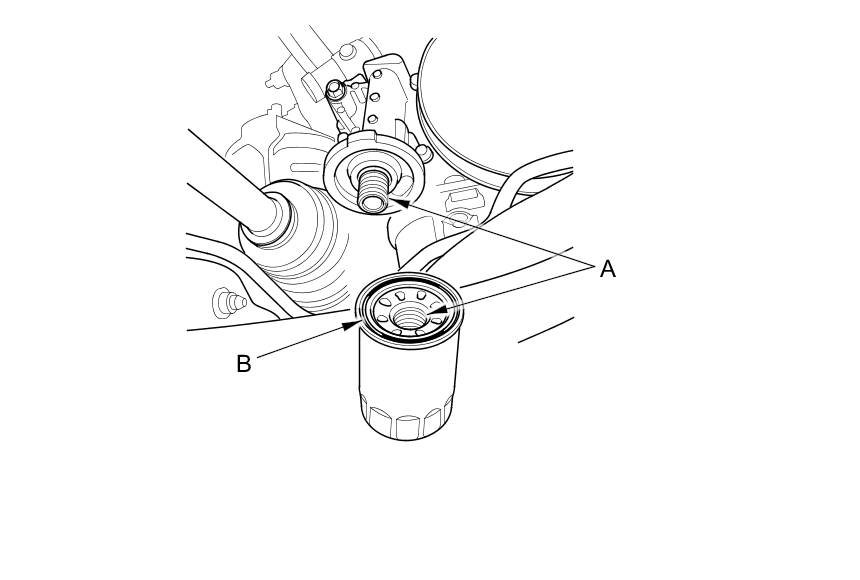 3. Inspect the threads (A) and the rubber seal (B) on the new filter. Clean the seat on the oil filter base, then apply a light coat of new engine oil to the filter rubber seal. Use only filters with a built-in bypass system.