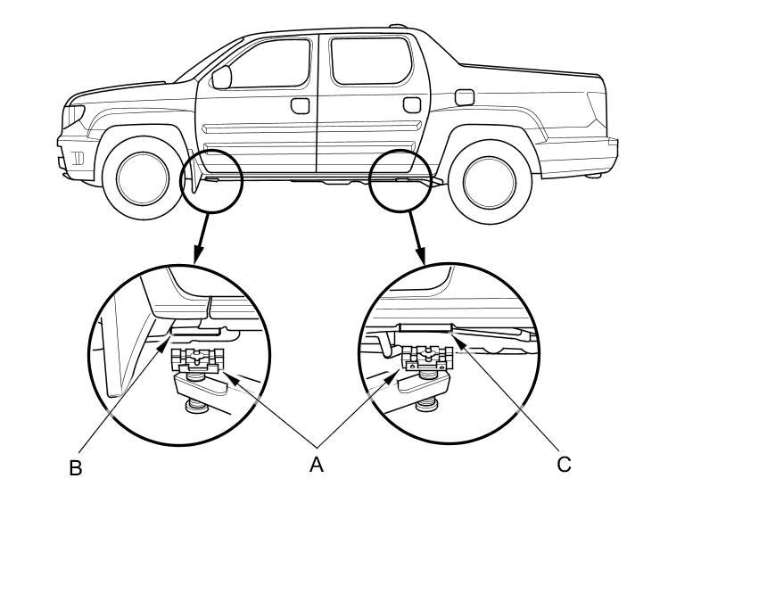 1. Position the lift pads (A) under the vehicle's front support points (B) and rear support points (C).
