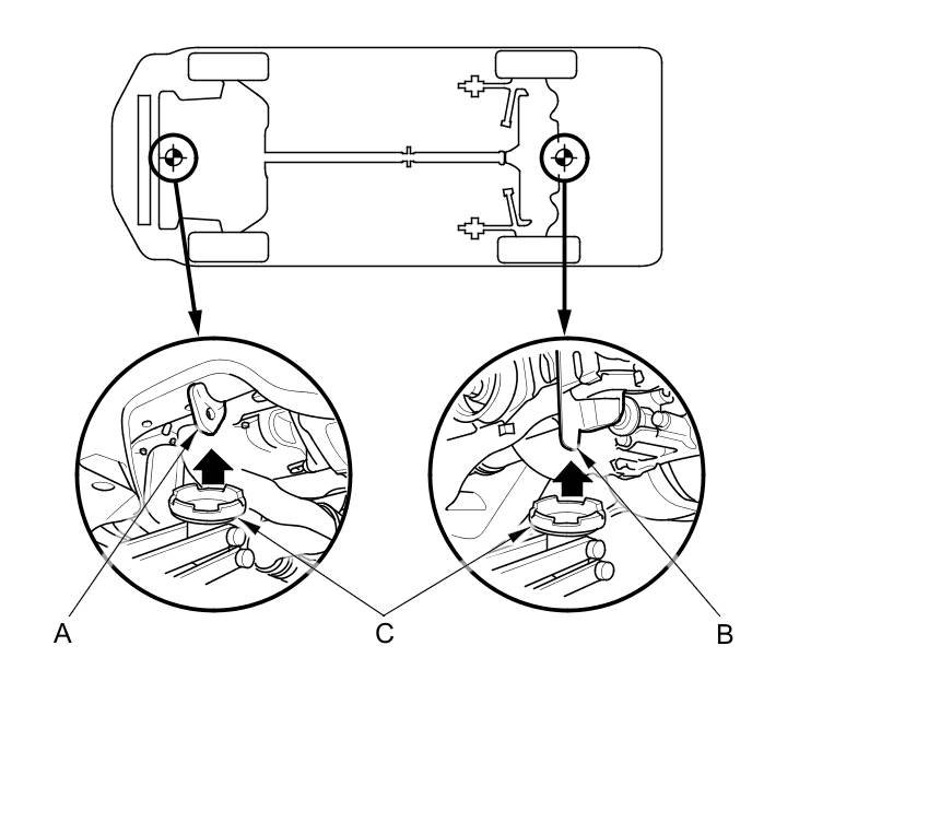 3. Position the floor jack under the front jacking bracket (A) or the rear jacking bracket (B). Center the jacking bracket on the jack lift platform (C), and jack up the vehicle high enough to fit the safety stands under it.