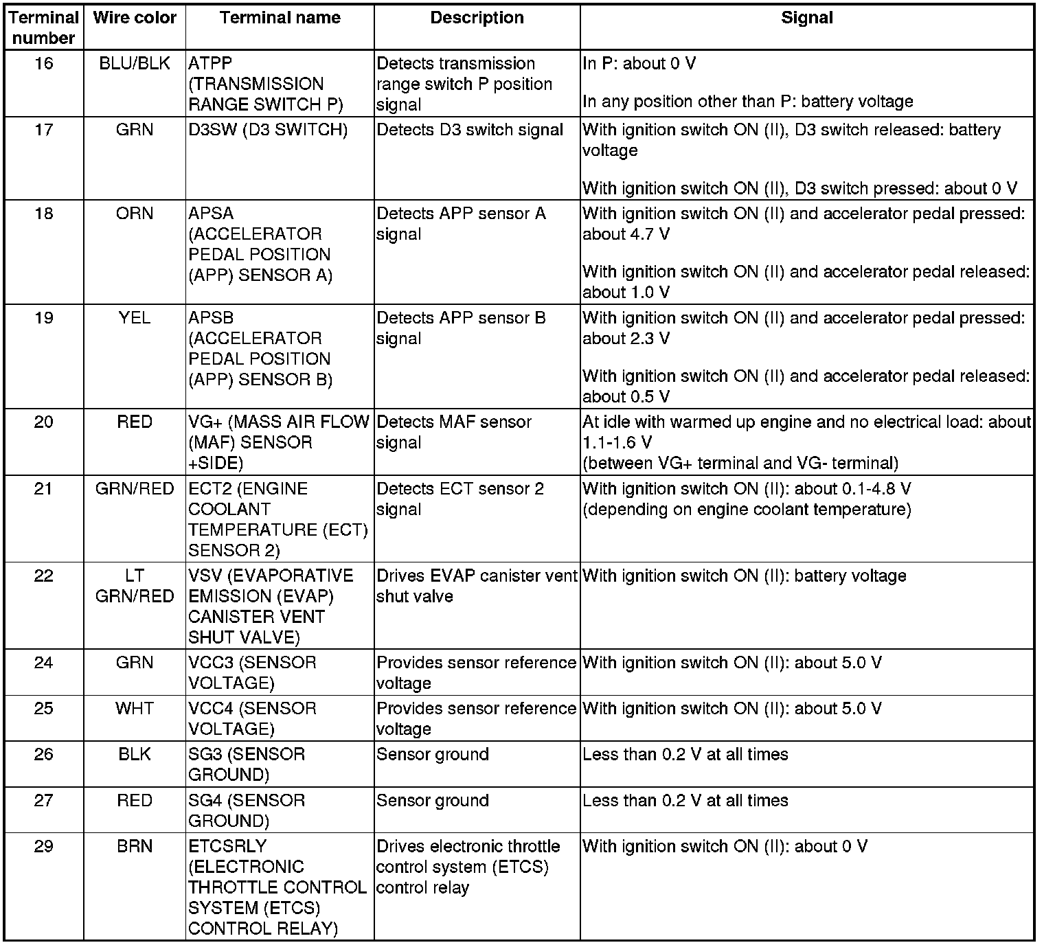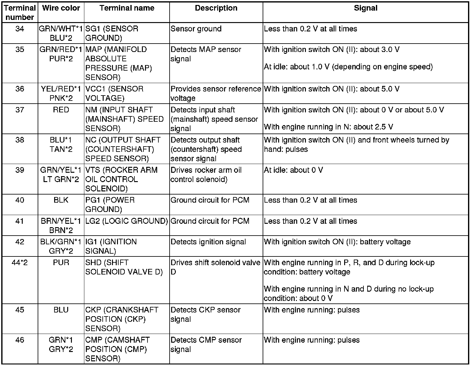 PCM Inputs and Outputs at PCM Connector A (square) (49P)