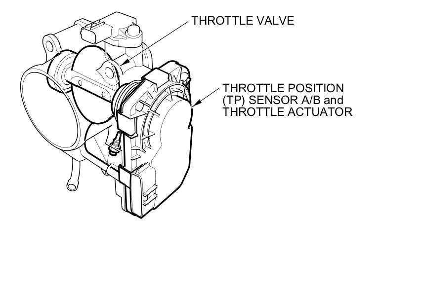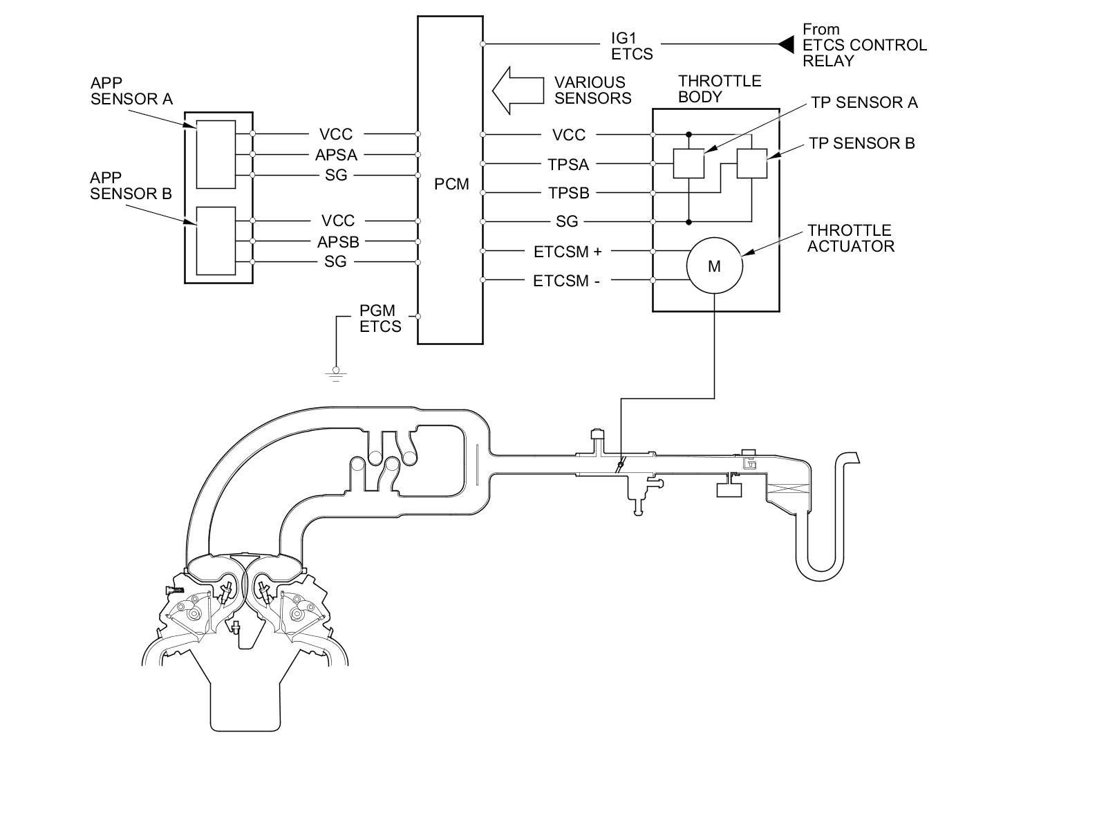 The electronic throttle control system consists of the throttle actuator, throttle position (TP) sensor A/B, accelerator pedal position (APP) sensor A/B, the electronic throttle control system (ETCS) control relay, and the PCM.
