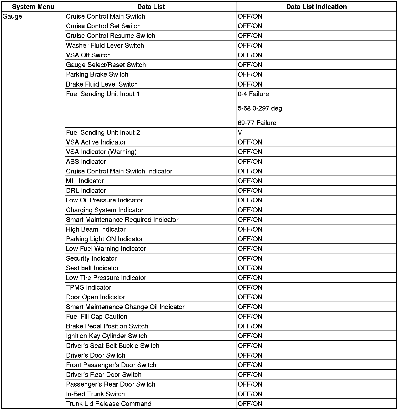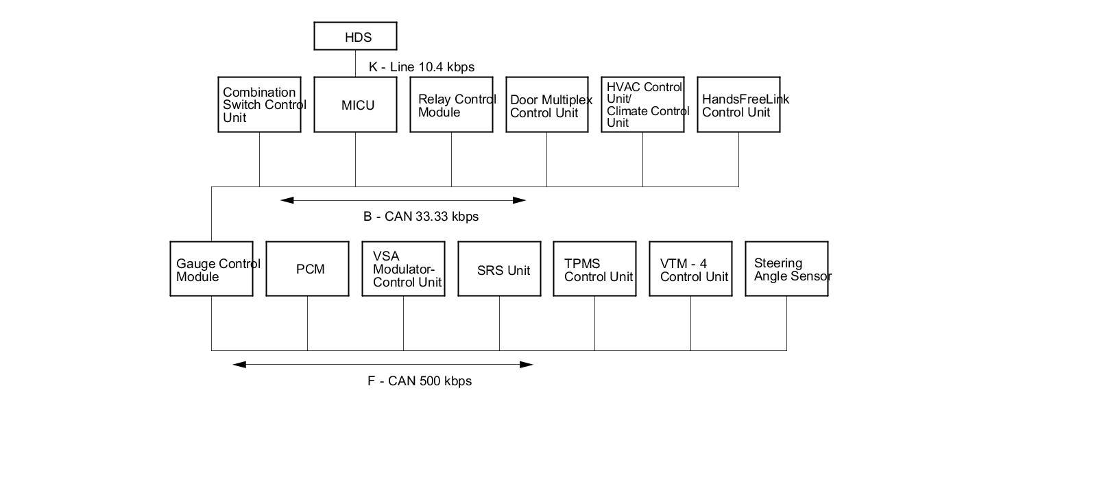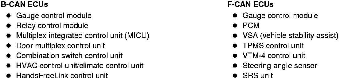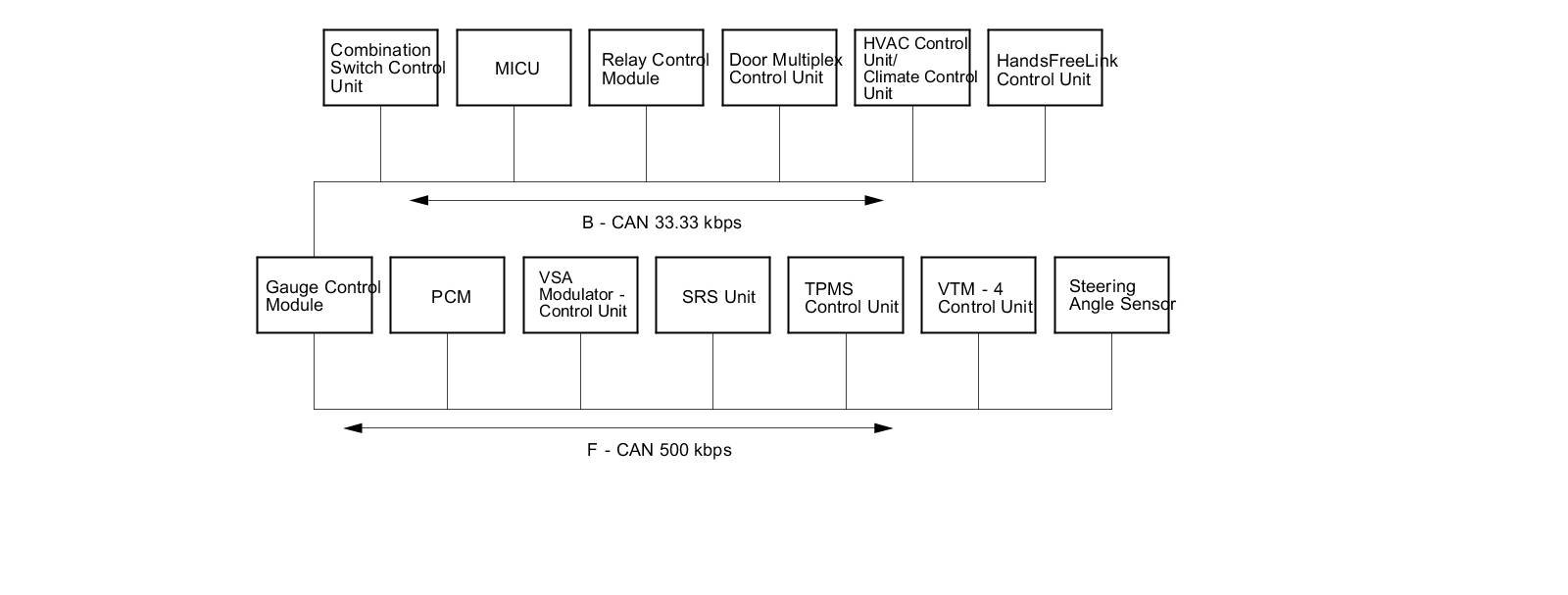 The body controller area network (B-CAN) and the fast controller area network (F-CAN) share information between multiple electronic control units (ECUs). B-CAN communication moves at a slower speed (33.33 kbps) for convenience related items and for other functions. F-CAN information moves at a faster speed (500 kbps) for "real time" functions such as fuel and emissions data. To allow both systems to share information, the gauge control module translates and relays the information from B-CAN to F-CAN and from F-CAN to B-CAN. This is called the Gateway Function.