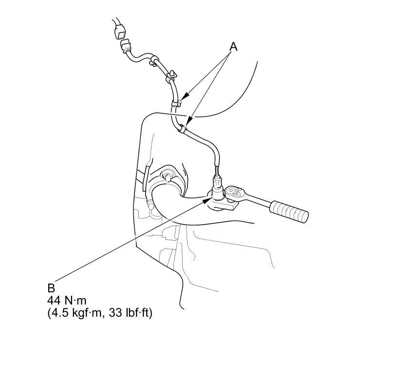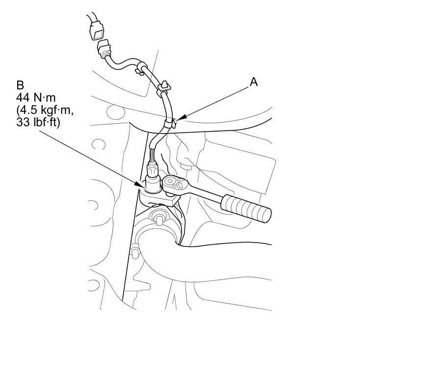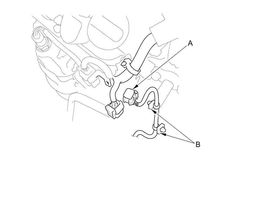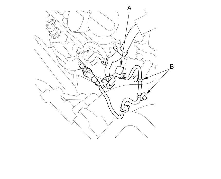1. Disconnect the front secondary HO2S 4P connector (A), and remove the harness clamps (B).