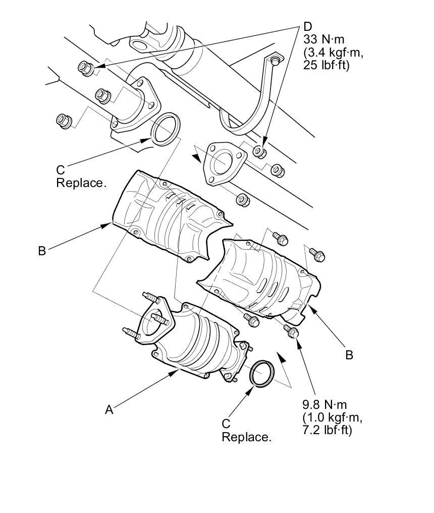 4. Install the parts in the reverse order of removal with new gaskets (C) and new self-locking nuts (D).