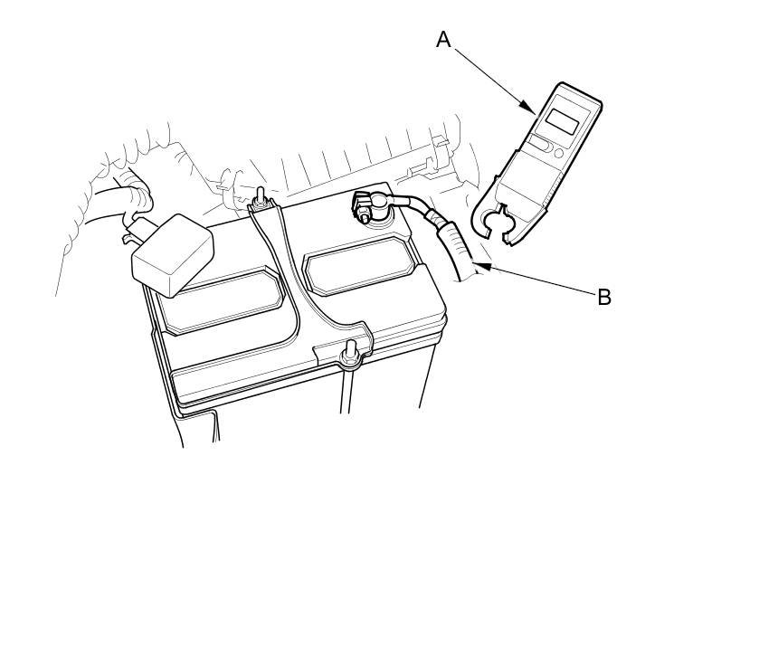 14. Connect the red (+) test lead (A) to the negative terminal (B) of the battery ground cable.