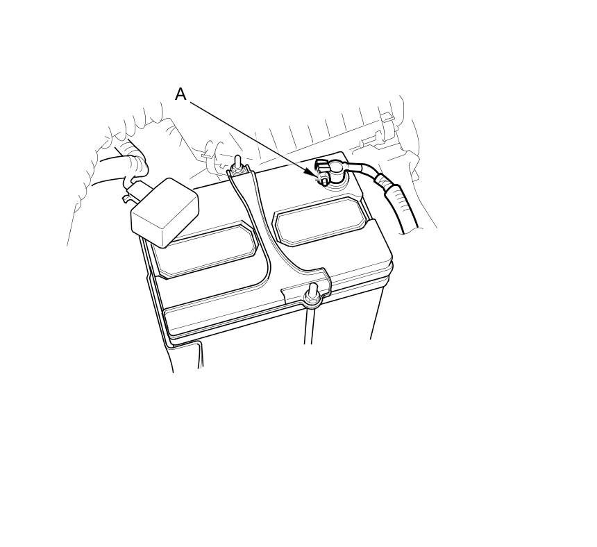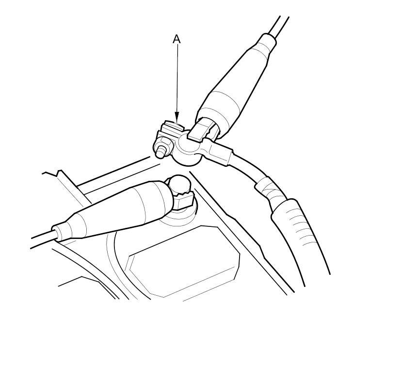 16. Disconnect the negative terminal (A) of the battery ground cable from the battery negative terminal.