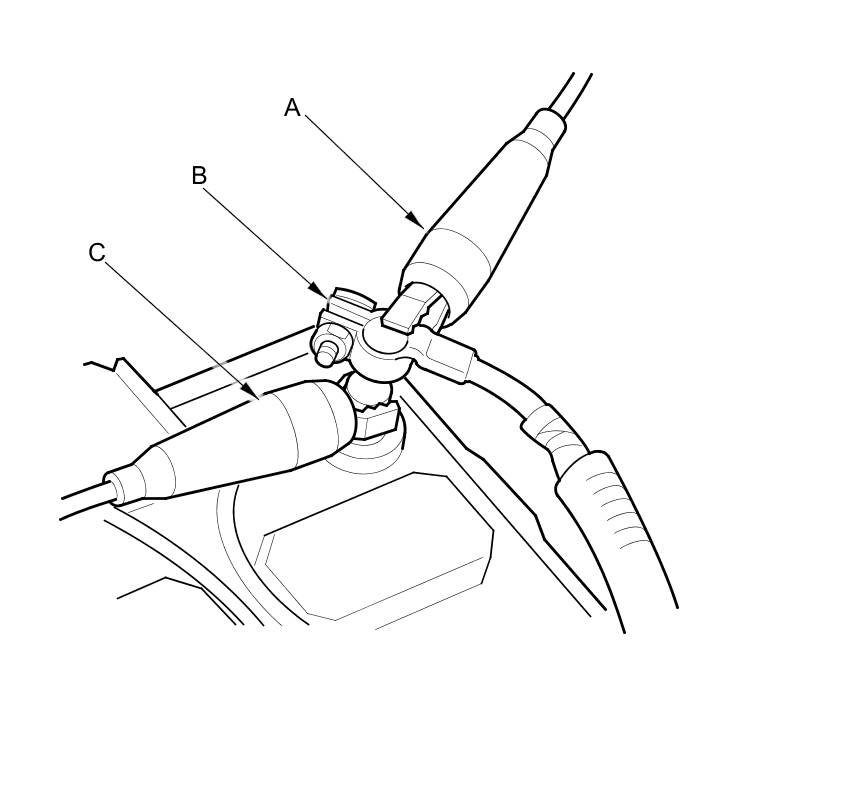 15. Carefully slide the negative terminal of the battery ground cable upwards from the battery negative terminal post to maintain contact and avoid disconnection. Then connect the black (-) test lead (C) to the battery negative terminal post.