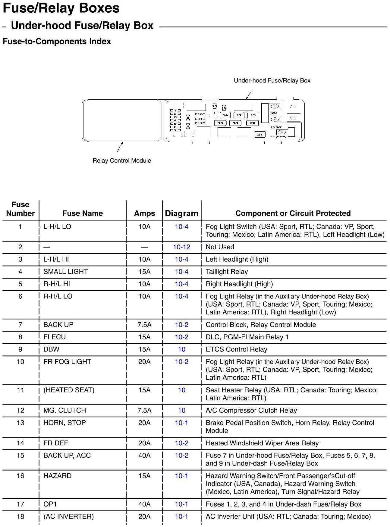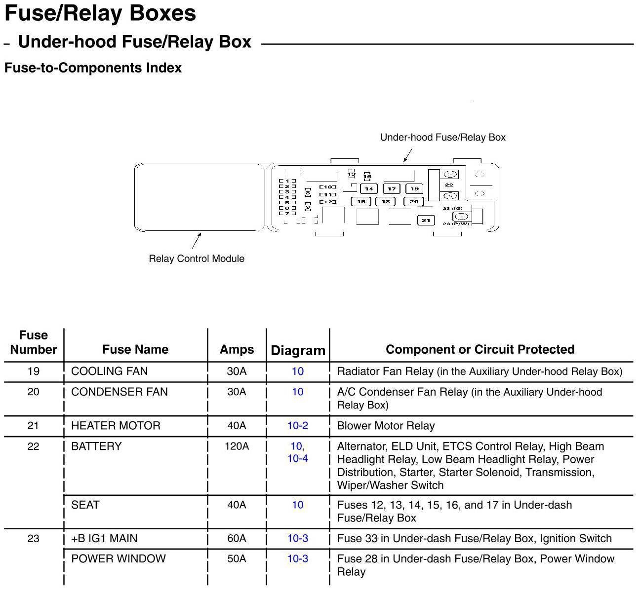 Under-Hood Fuse/Relay Box - Fuse-to-Components Index