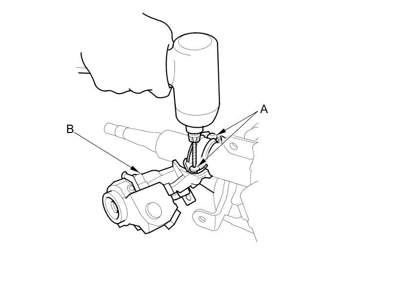 3. Center-punch both of the shear bolts (A), and drill their heads off with a 5 mm (0.2 in) drill bit. Be careful not to damage the steering lock (B) when removing the shear bolts.