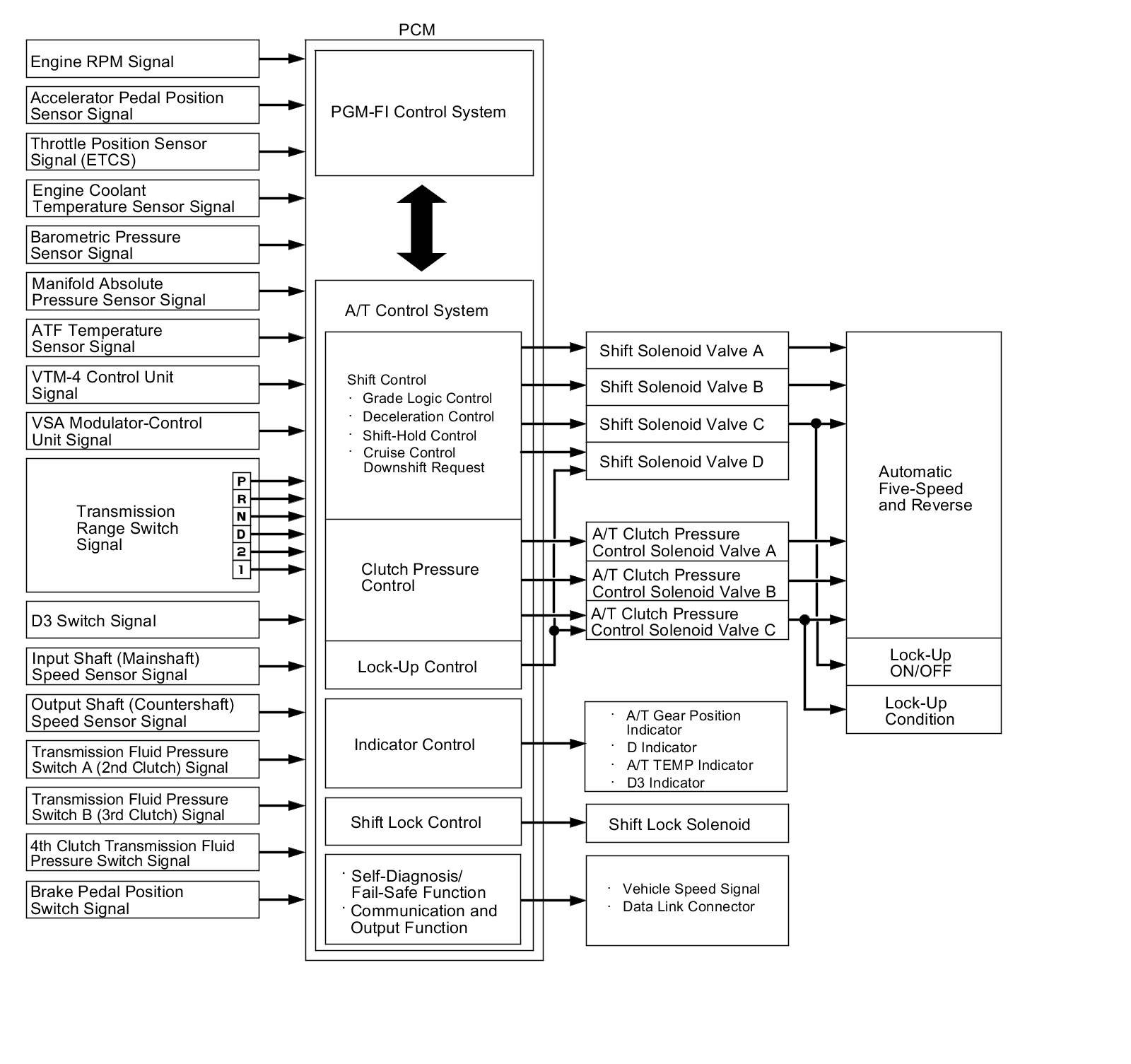 The PCM receives input signals from the sensors, switches, and other control units, processes data, and outputs signals for the engine control system and A/T control system. The A/T control system includes shift control, clutch pressure control, and lock-up control. The PCM switches the shift solenoid valves and A/T clutch pressure control solenoid valves ON and OFF to control gear selection and torque converter clutch lock-up.