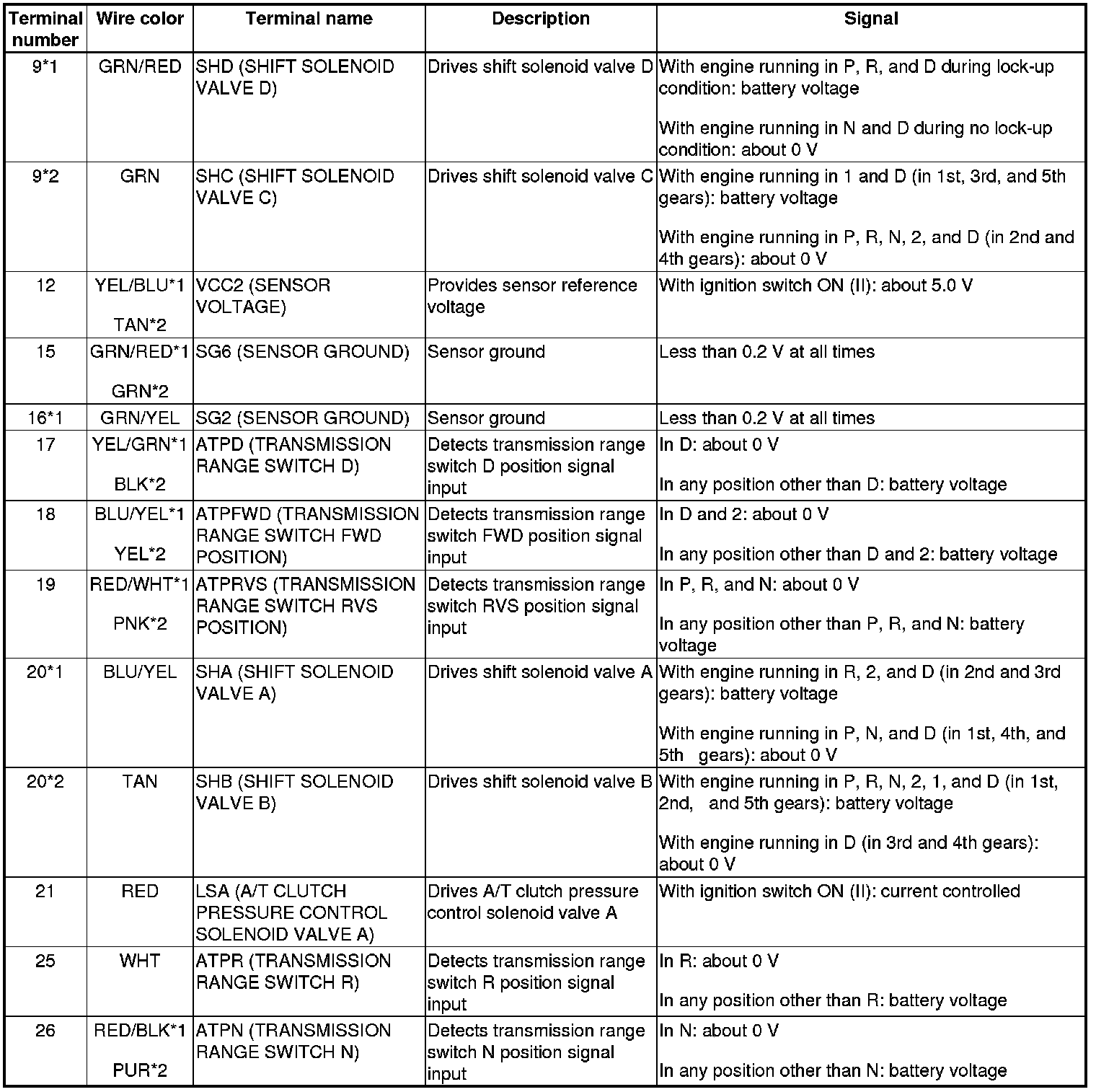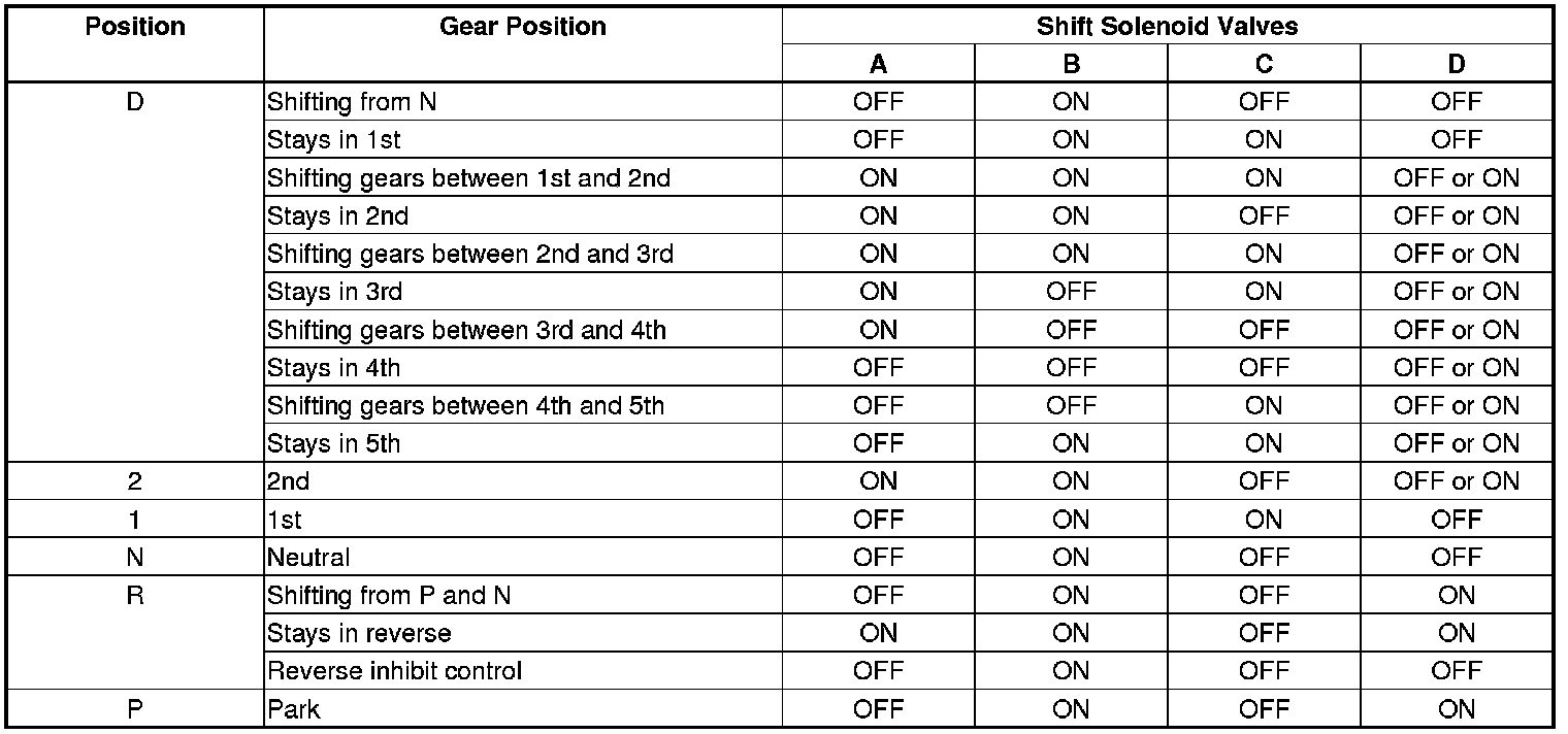 The combination of driving signals to shift solenoid valves A, B, C, and D are shown in the table.