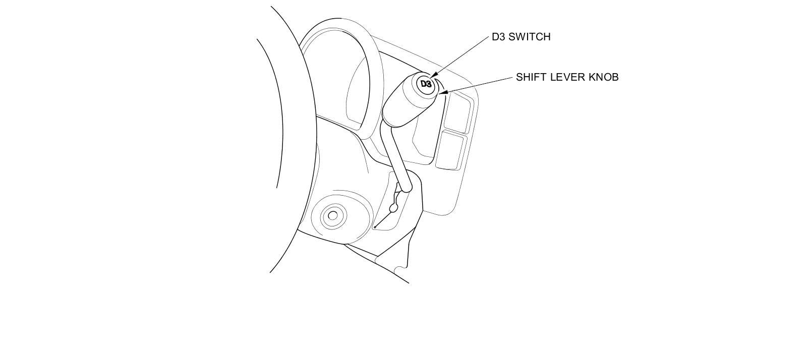 This automatic transmission is equipped with the D3 driving mode in D. D has two modes; general driving mode (shifts gears automatically 1st through 5th), and the D3 driving mode (shifts gears automatically 1st through 3rd). The transmission mode switches by pressing the D3 button on the shift lever knob in D.