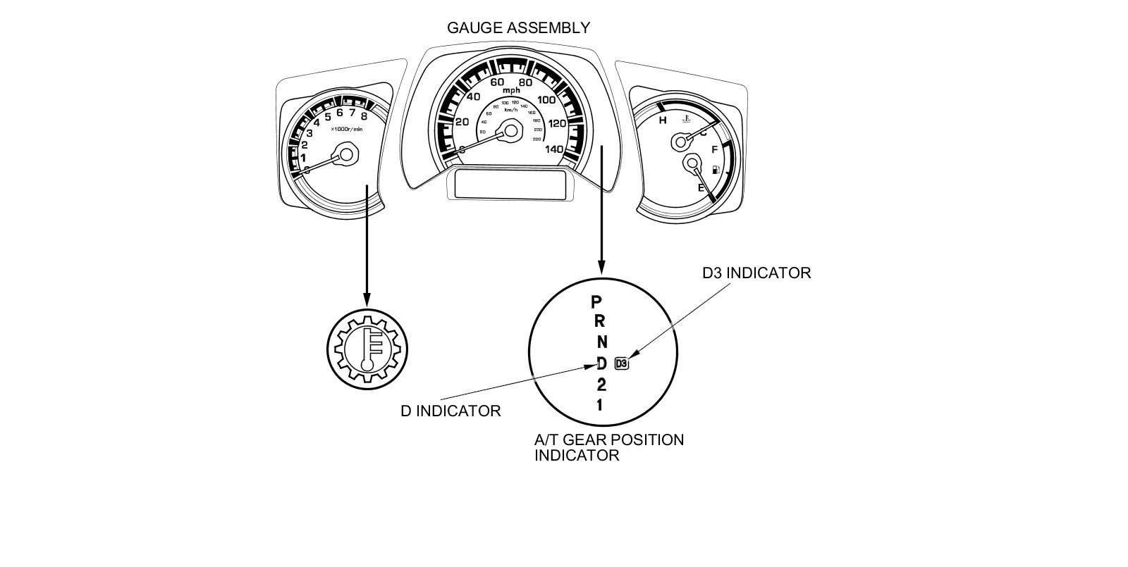 In D3 driving mode, the D3 indicator next to the D indicator in the gauge control module comes on. The D3 driving mode is canceled by pressing the D3 button, and the D3 indicator goes off. Also, the D3 driving mode is canceled when the ignition switch is turned to LOCK (0). When the shift lever is moved out of D in the D3 driving mode, the D3 indicator goes off, but the transmission returns to the D3 driving mode when the shift lever is returned to D, and the D3 indicator comes on.