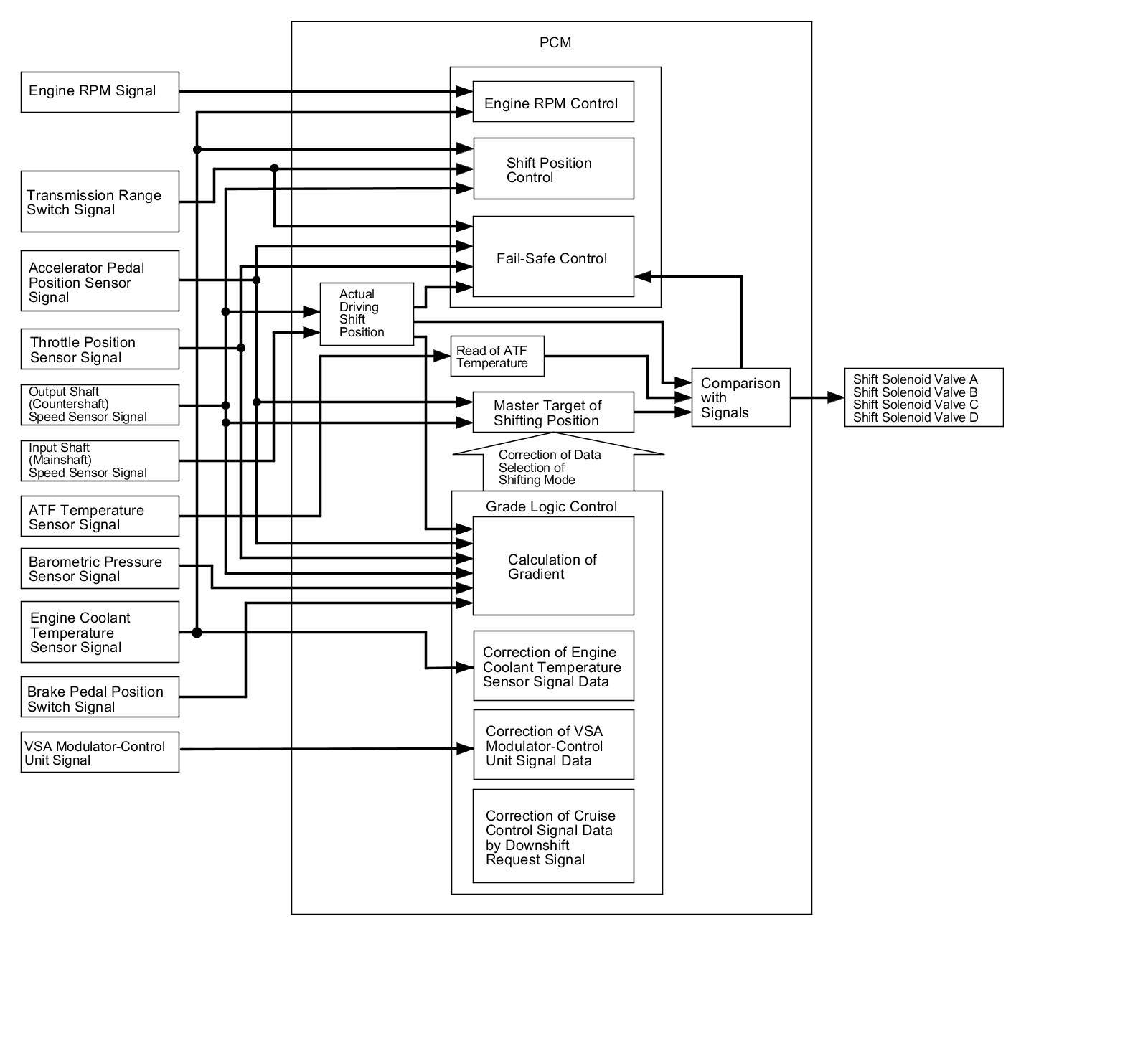 The grade logic control system is used to control shifting in D. The PCM compares actual driving conditions with programmed driving conditions, based on the input from the accelerator pedal position sensor, the engine coolant temperature sensor, the barometric pressure sensor, the brake pedal position switch signal, and the shift lever position signal, to improve shifting control while the vehicle is ascending or descending a slope.