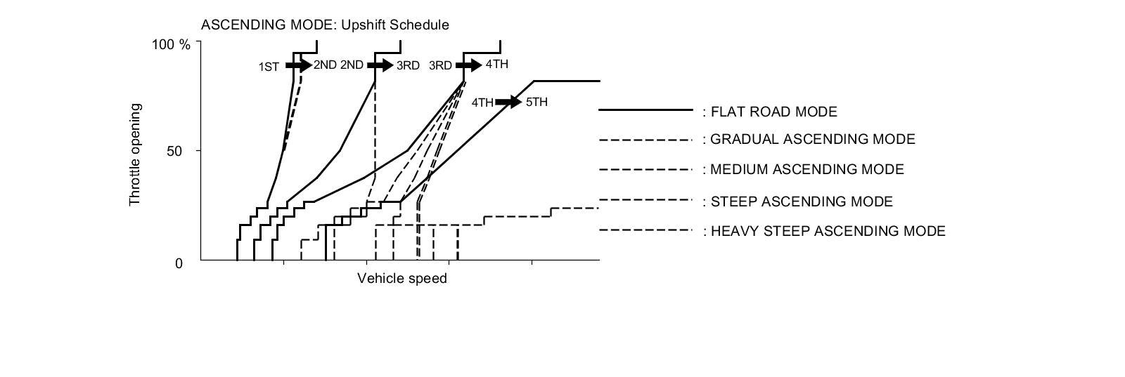 When the PCM determines that the vehicle is climbing a hill in D, the system extends the engagement area of 2nd gear, 3rd gear, and 4th gear to prevent the transmission from frequently shifting between 2nd and 3rd gears, between 3rd and 4th gears, and between 4th and 5th gears, so the vehicle can run smoothly and have more power when needed.