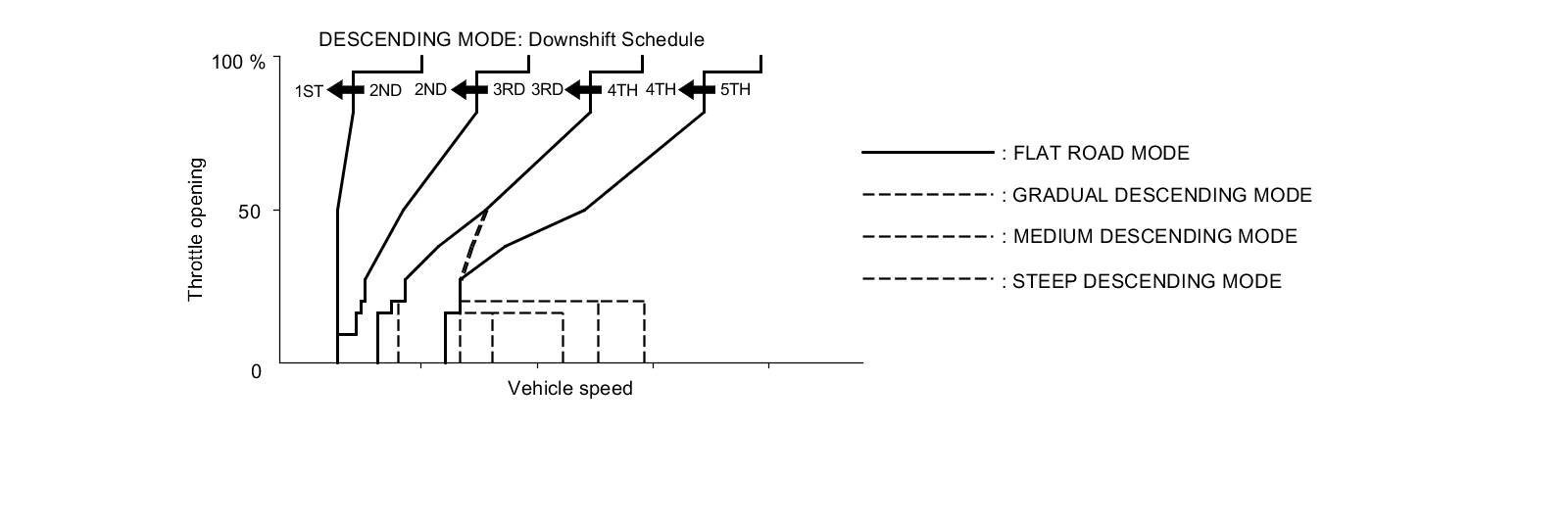 When the PCM determines that the vehicle is going down a hill in D, the upshift speed from 4th to 5th gear, 3rd to 4th gear, and from 2nd to 3rd (when the throttle is closed) becomes higher than the set speed for flat road driving to extend the 4th gear, 3rd gear, and 2nd gear driving areas. This, in combination with engine braking from the deceleration lock-up, achieves smooth driving when the vehicle is descending. There are three descending modes stored in the PCM with different 4th gear driving areas, 3rd gear driving areas, and 2nd gear driving areas based on the steepness of the grade. When the vehicle is in 5th or 4th gear and the vehicle is decelerating while applying the brakes on a steep hill, the transmission will downshift to a lower gear. When you accelerate, the transmission will then return to a higher gear.