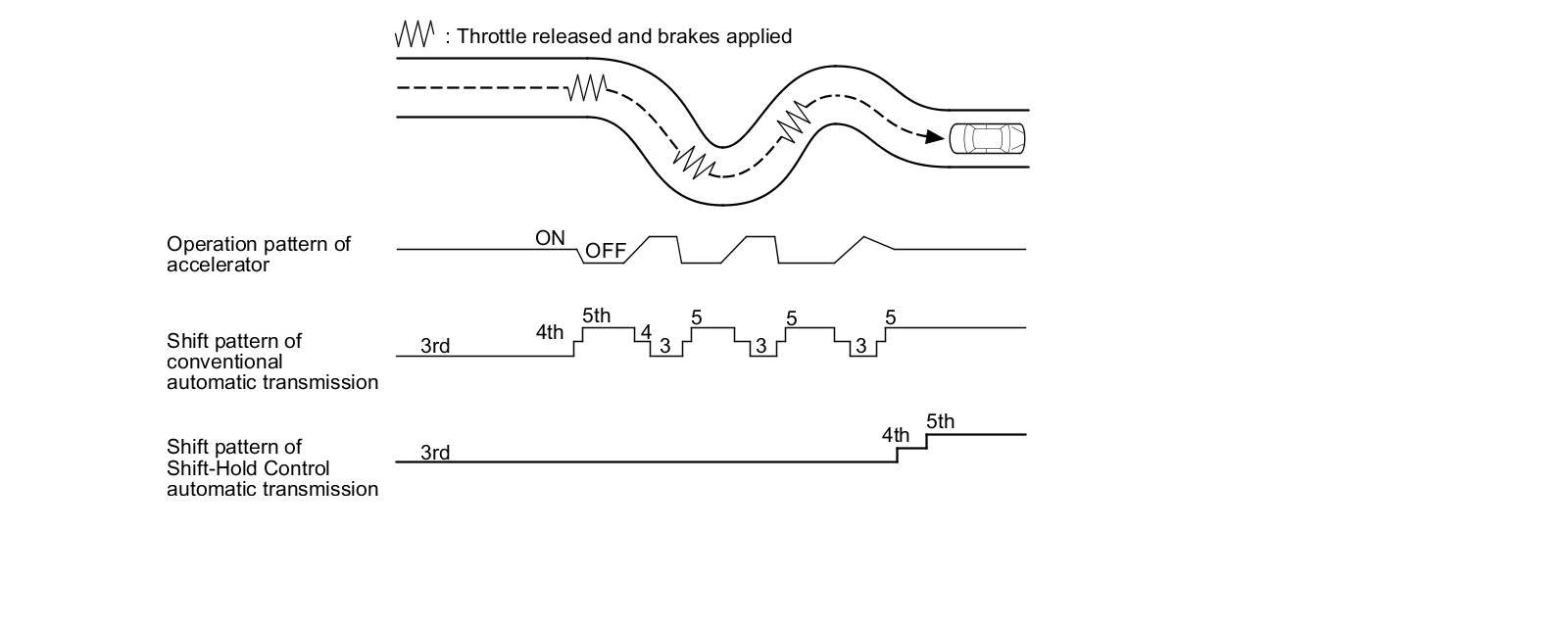 When negotiating winding roads, the accelerator pedal is suddenly released and the brakes are applied, as is the case when decelerating at the entrance of a corner, Shift-Hold Control keeps the transmission in its current (lower) gear as it negotiates the corner and accelerates out.