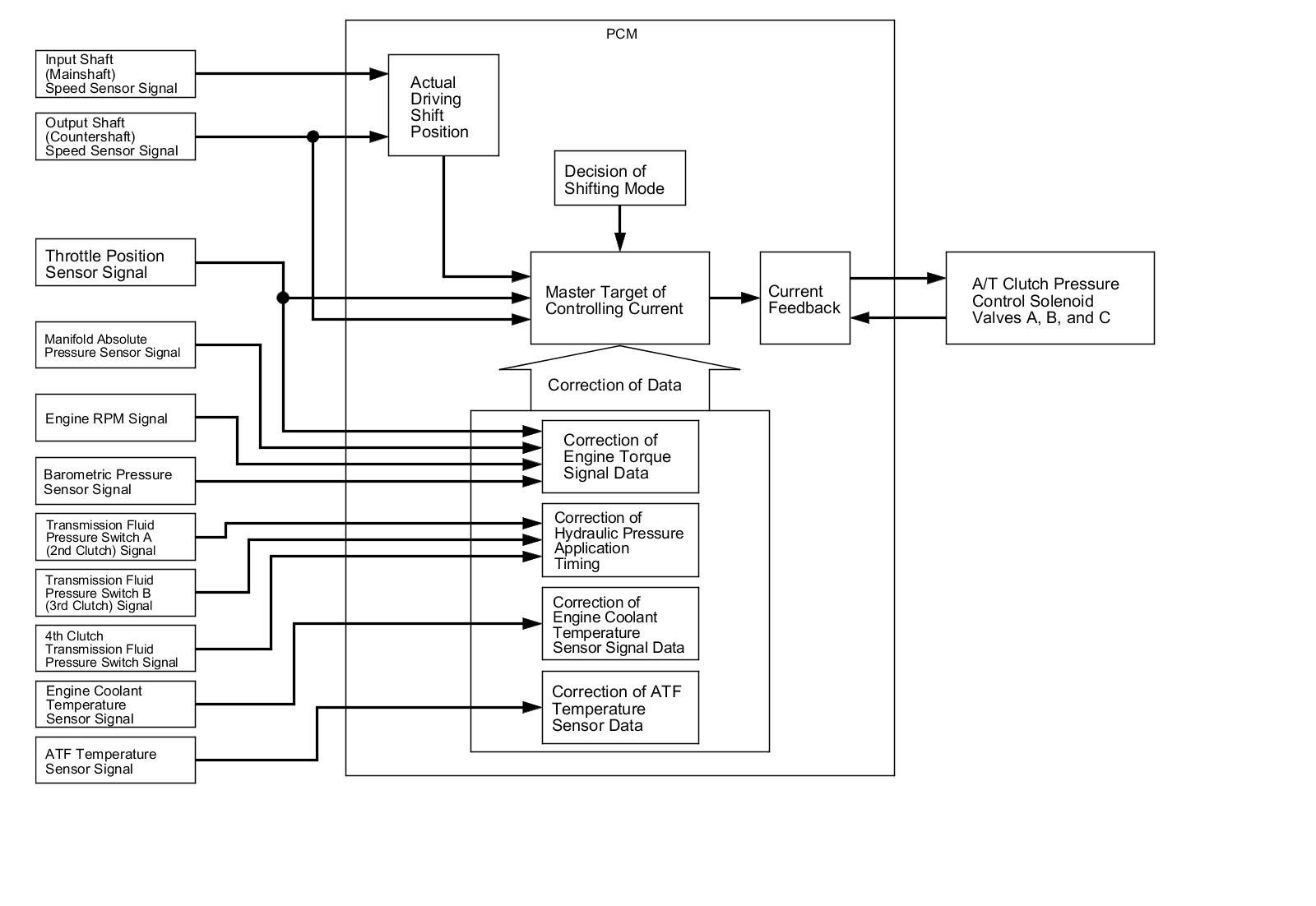 The PCM actuates A/T clutch pressure control solenoid valves A, B, and C to control the clutch pressure. When shifting between gears, the clutch pressure regulated by A/T clutch pressure control solenoid valves A, B, and C engages and disengages the clutch smoothly.
