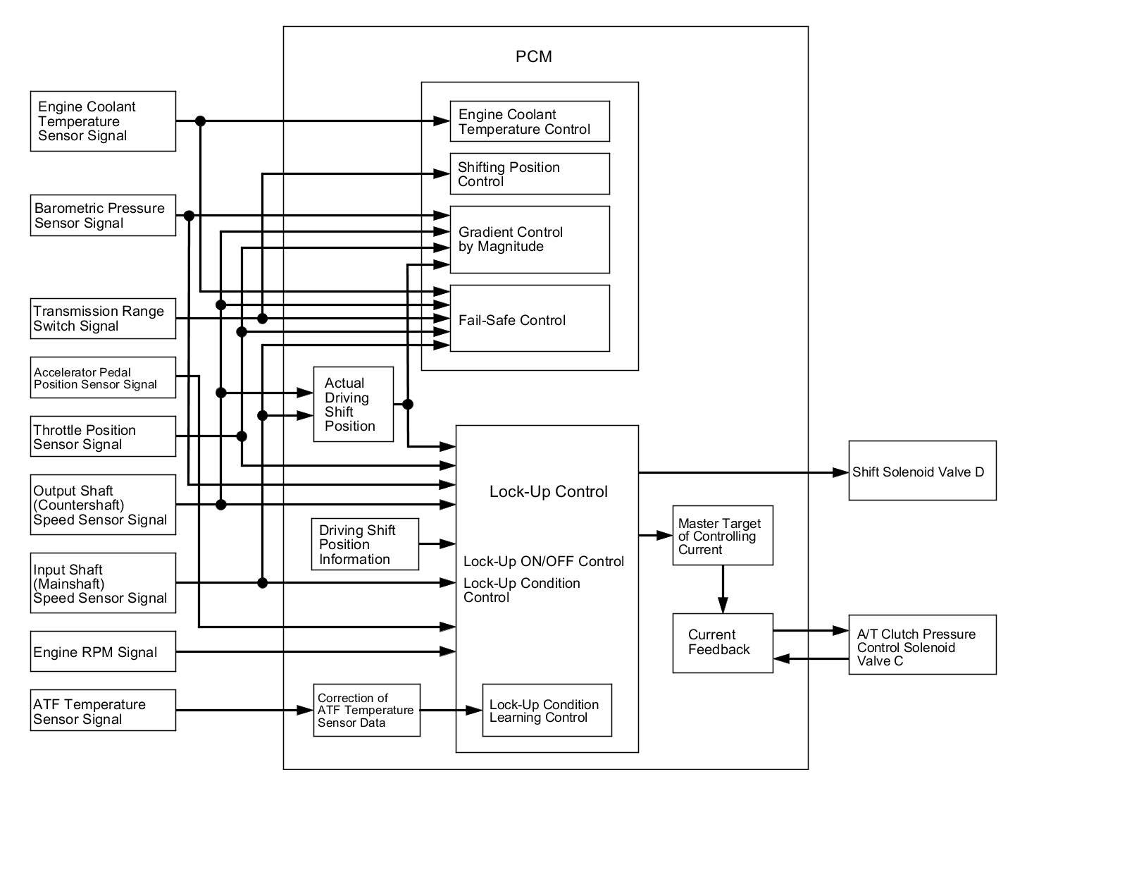 Shift solenoid valve D controls the hydraulic pressure to switch the lock-up shift valve and lock-up ON and OFF. When the PCM actuates shift solenoid valve D and A/T clutch pressure control solenoid valve C ON, and lock-up starts. A/T clutch pressure control solenoid valve C regulates and applies hydraulic pressure to the lock-up control valve to control the amount of lock-up. The lock-up mechanism operates in D (2nd, 3rd, 4th, and 5th gears), and in the D3 driving mode (2nd and 3rd gears).
