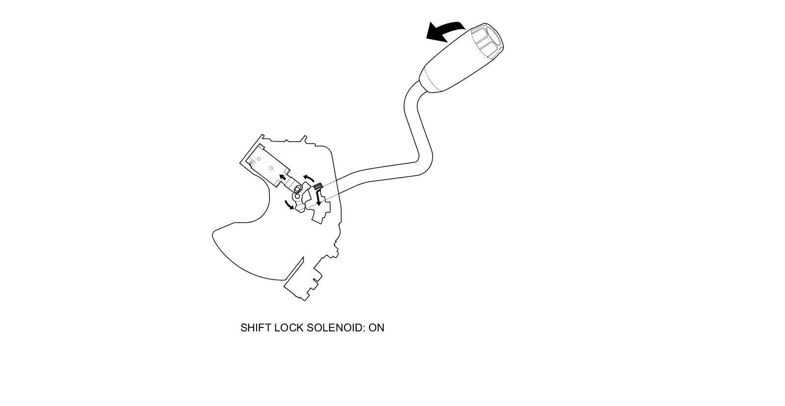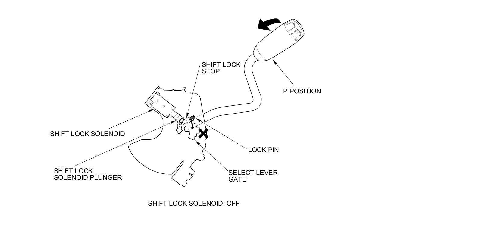 The shift lock system prevents the shift lever from moving unless certain conditions are met. The shift lock solenoid is normally OFF. After starting the engine in P, the shift lever cannot move to any other position from P because the shift lock stop stops the lock pin. When the brake pedal is pressed and the accelerator pedal is not pressed, the PCM commands the shift lock solenoid ON; the shift lock solenoid plunger in the shift lock solenoid pulls the shift lock stop to release the lock pin. Pulling the shift lever allows the shift lever to move to any other position. When the brake pedal and the accelerator pedal are pressed at the same time, the PCM commands the solenoid OFF and the shift lock system is locked.