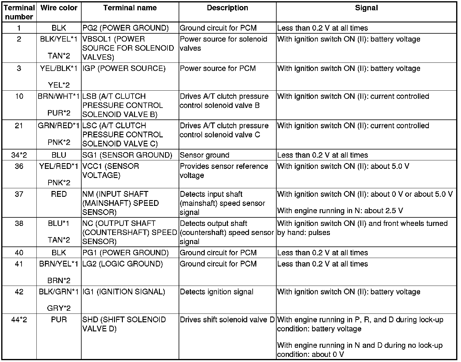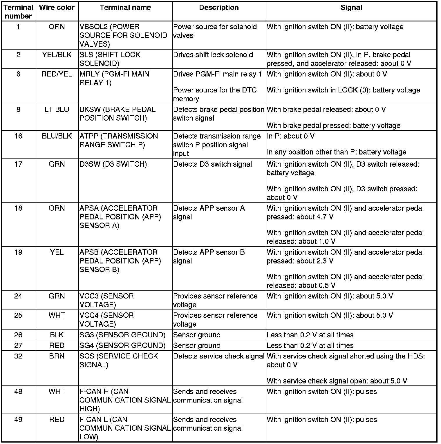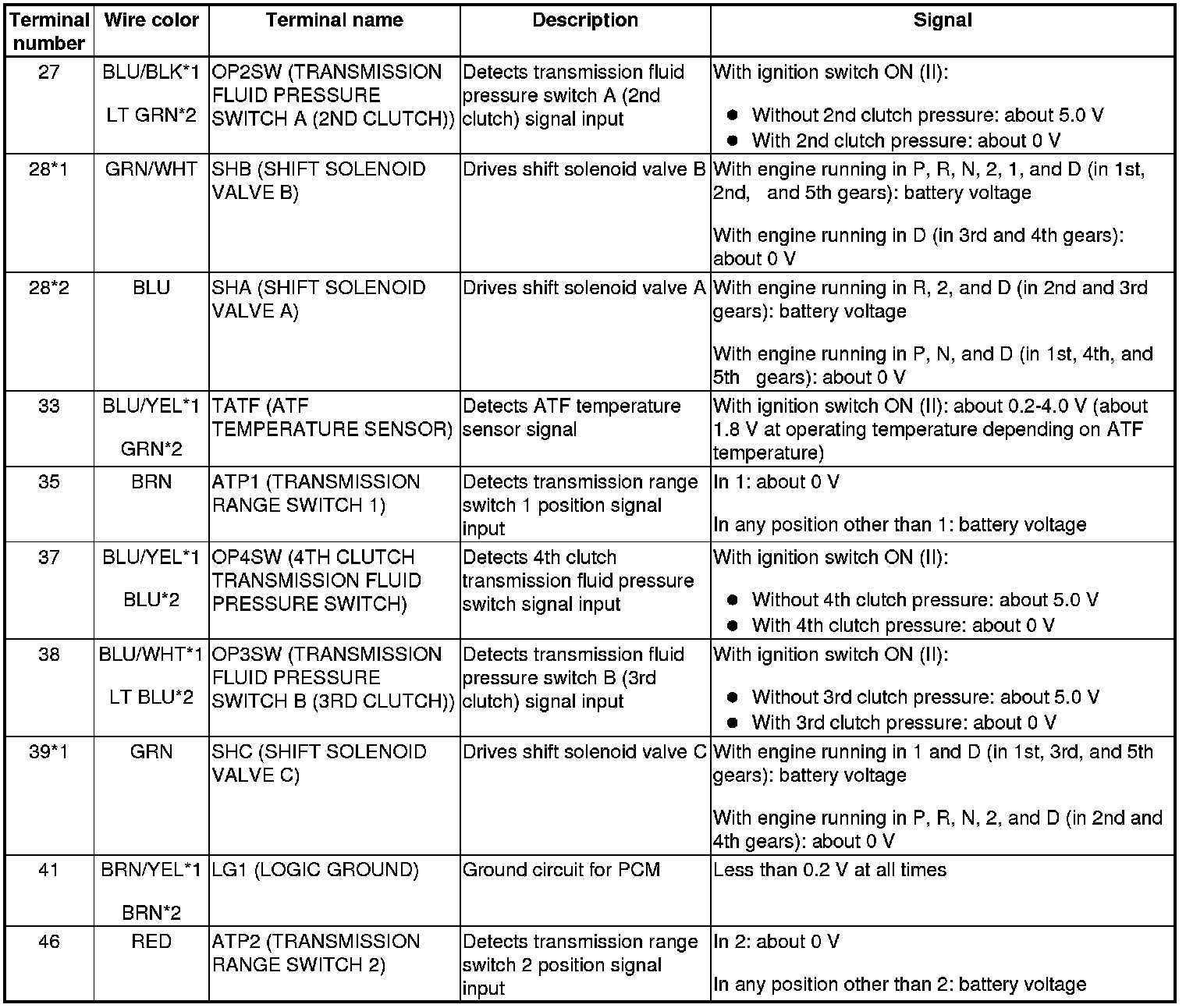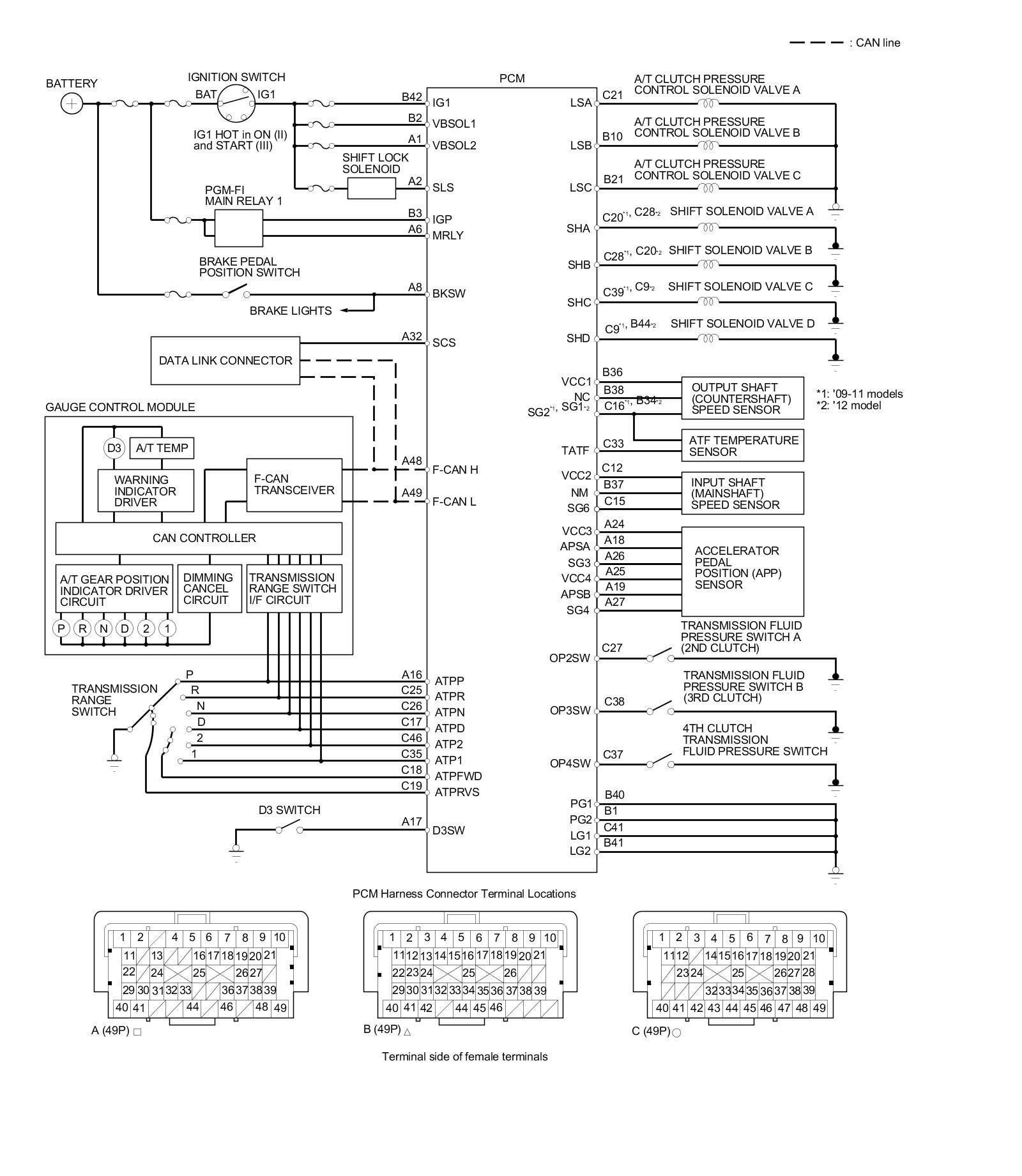 PCM A/T Control System Inputs and Outputs at PCM Connector A (square) (49P)