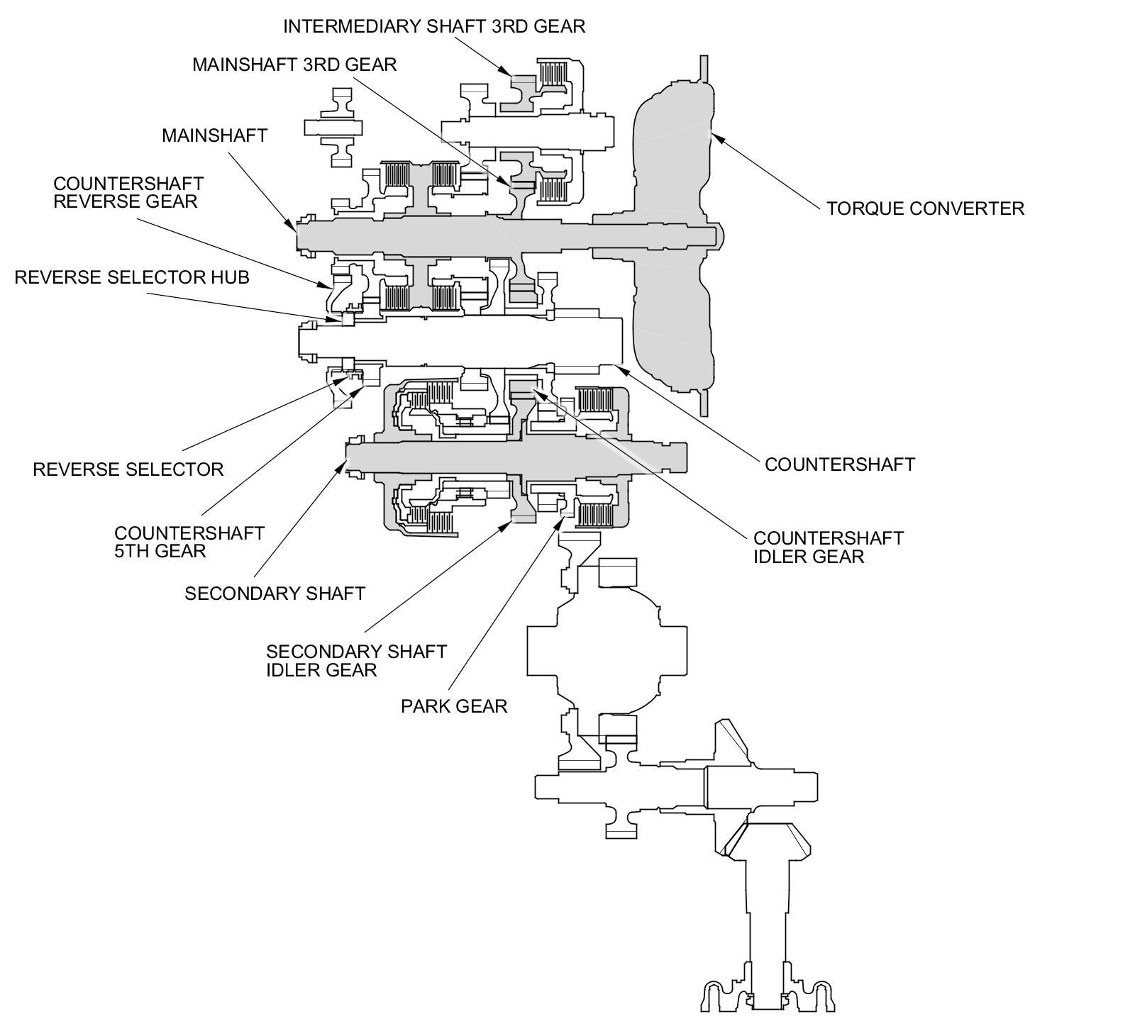 - When shifted from R, the reverse selector engages with the countershaft reverse gear and the reverse selector hub, and the reverse gear engages with the countershaft.
