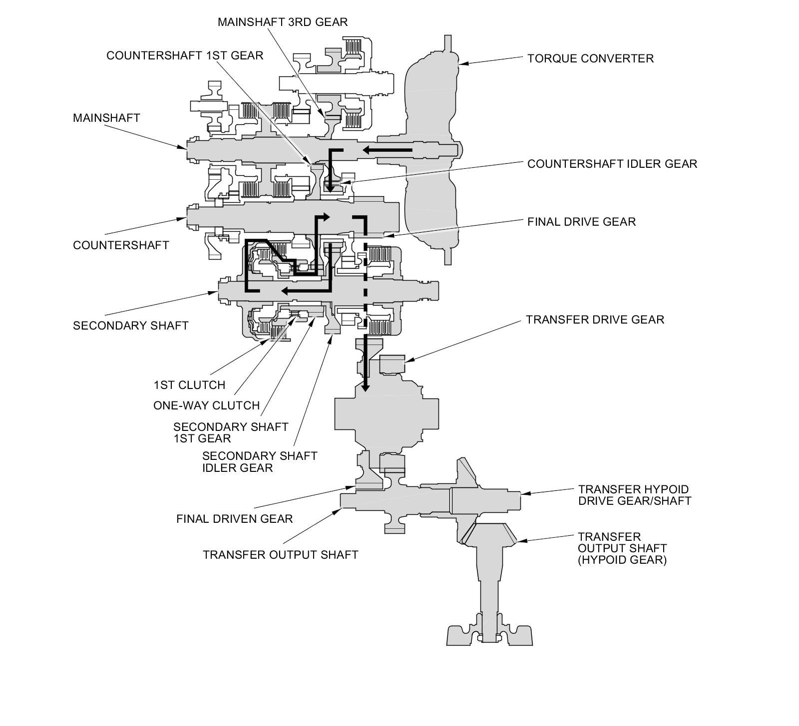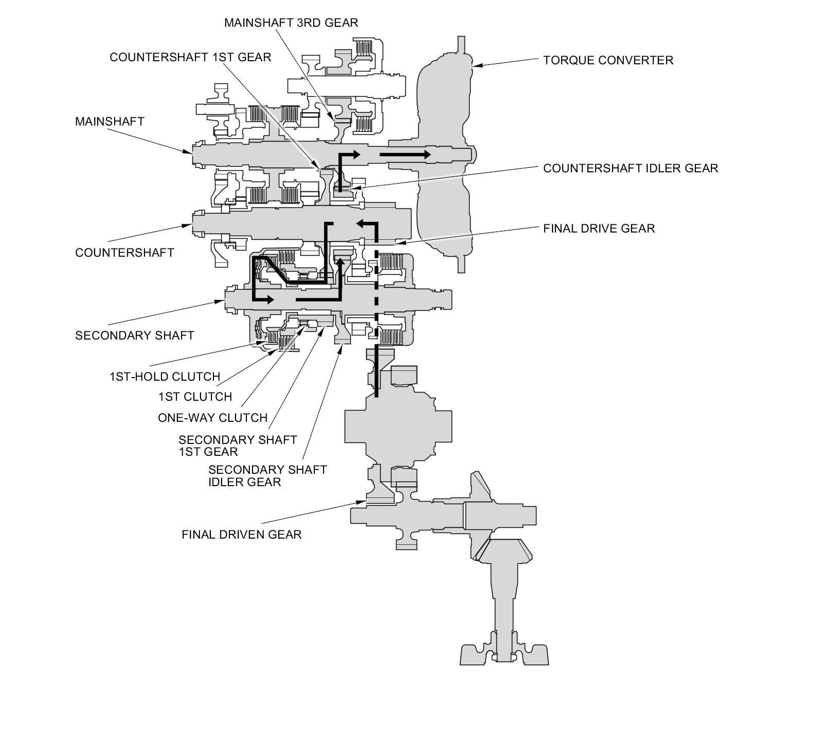 - The countershaft 1st gear drives the secondary shaft 1st gear, which in turn drives the secondary shaft via the 1st-hold clutch.