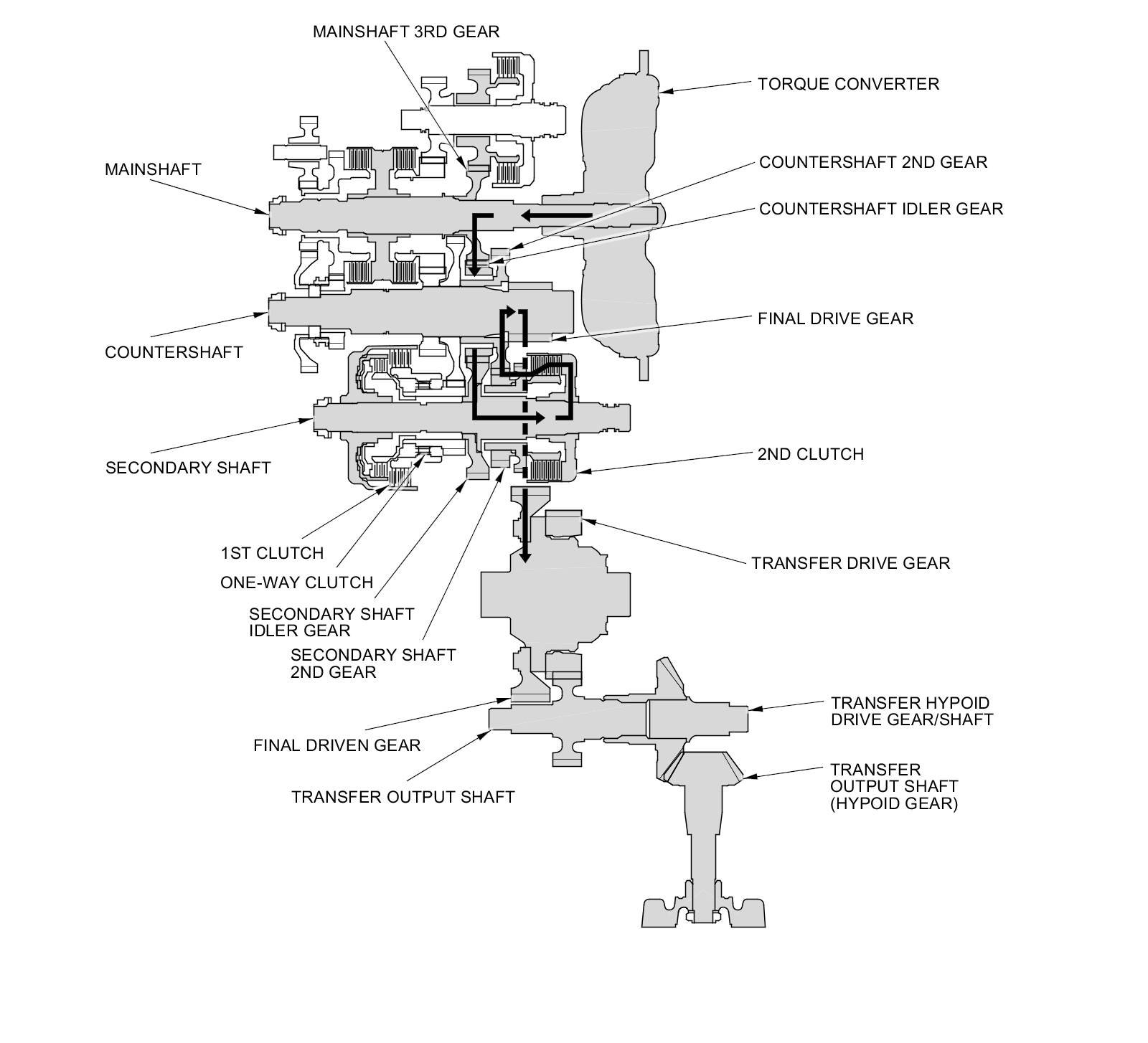- Hydraulic pressure is applied to the 2nd clutch, then the 2nd clutch engages the secondary shaft 2nd gear with the secondary shaft.