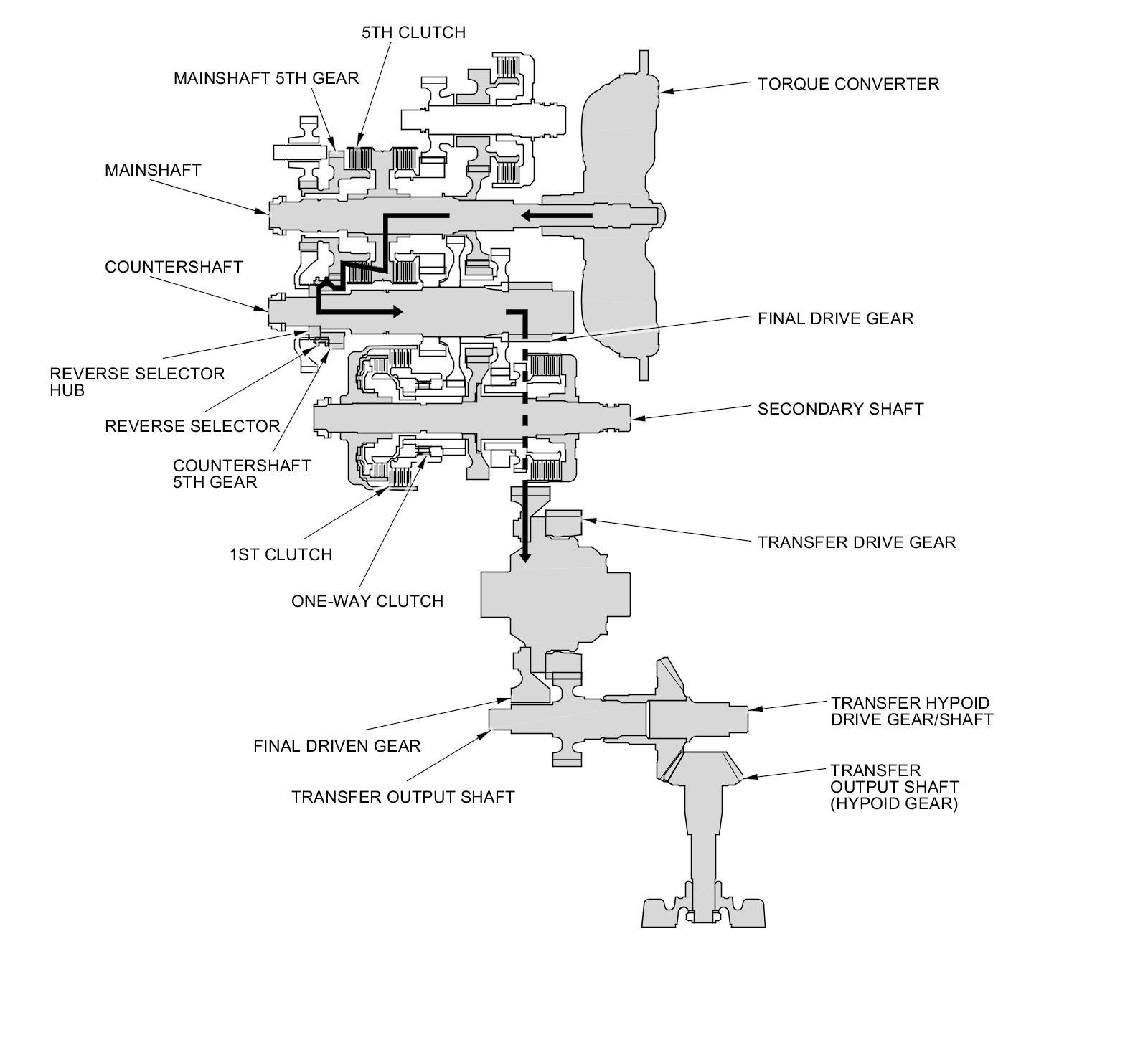 - Hydraulic pressure is applied to the 5th clutch, then the 5th clutch engages the mainshaft 5th gear with the mainshaft.