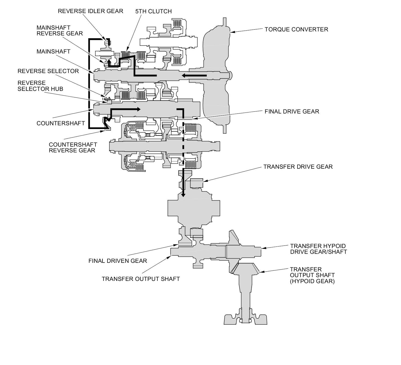 - Hydraulic pressure is applied to the 5th clutch, then the 5th clutch engages the mainshaft reverse gear with the mainshaft.